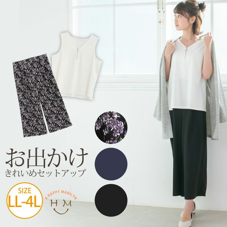 上下セット set トップス パンツ LL 3L 4L ぽっちゃり かわいい おしゃれ カジュアル 可愛い 大人 無地と花柄から選べる!! ノースリーブトップスと ワイドパンツ のセットアップ | 大きいサイズの通販ならハッピーマリリン
