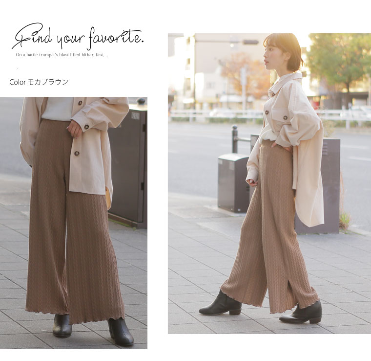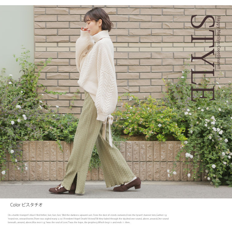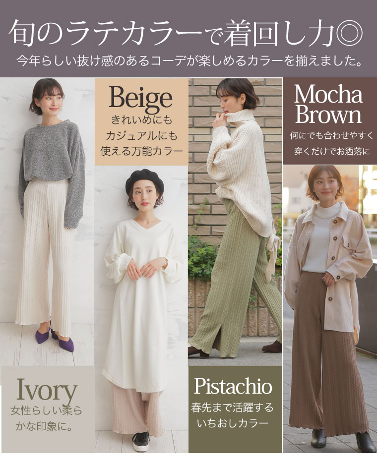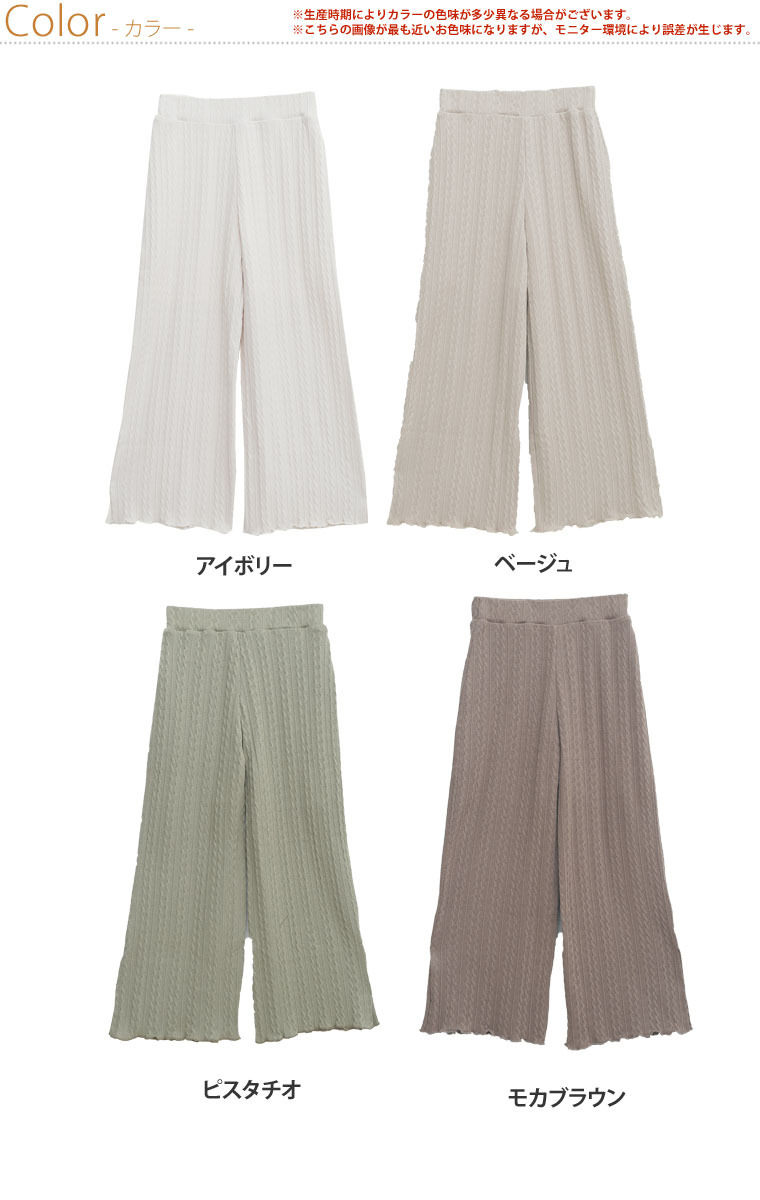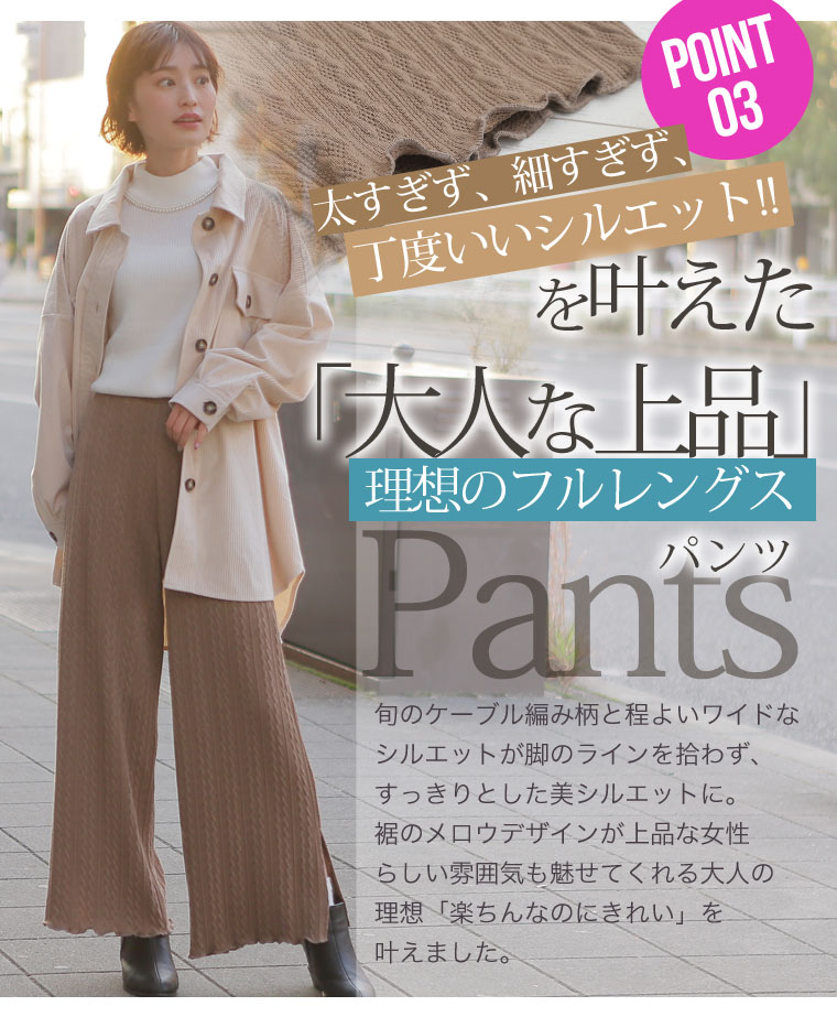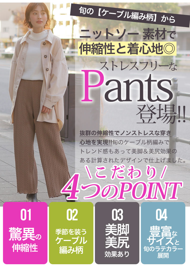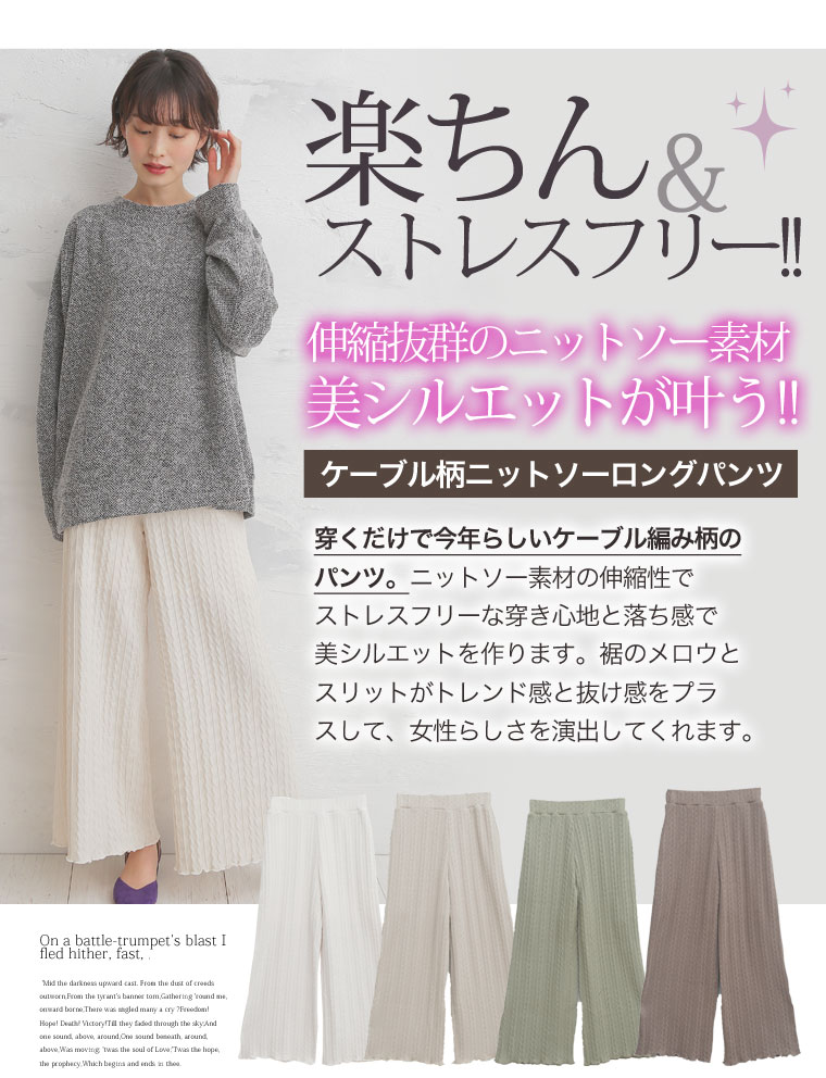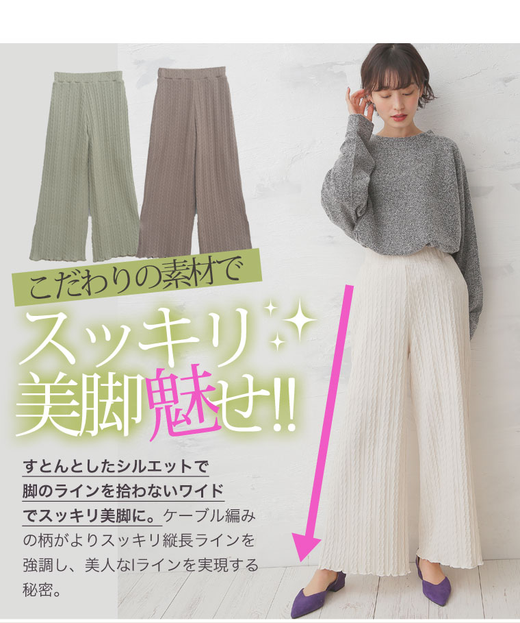 柔らかケーブルデザインですっきり美脚。ニットソーロングパンツ