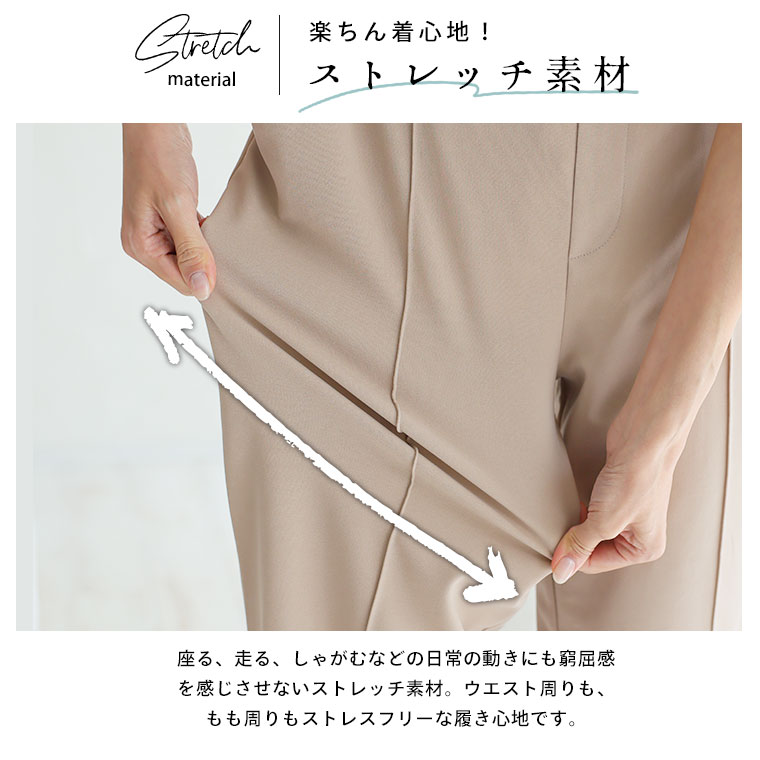 ■着用感:ちょうどいい、■着丈:足首、■バスト:-、■腕回り:-、■袖口:-、■袖丈:-、■首回り:-、■ウエスト:ぴったり、■ヒップ:ちょうどいい、■太もも:ちょうどいい ●伸びの良いストレッチ素材なので着心地楽ちんです。私の身長ではショート丈がちょうど良さそうです。