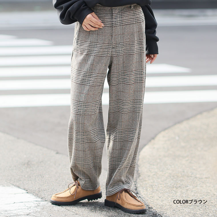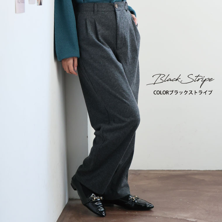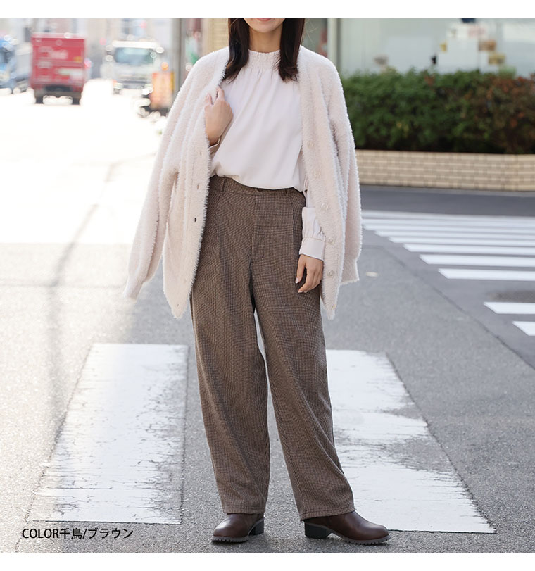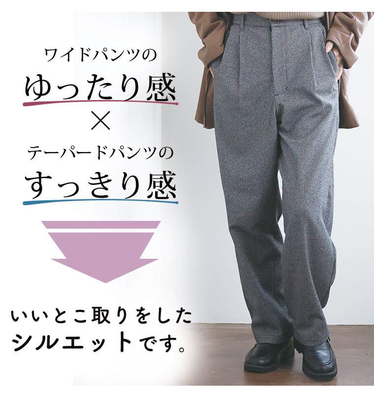 ウエストのタックを見せるテーパードパンツのスッキリ感