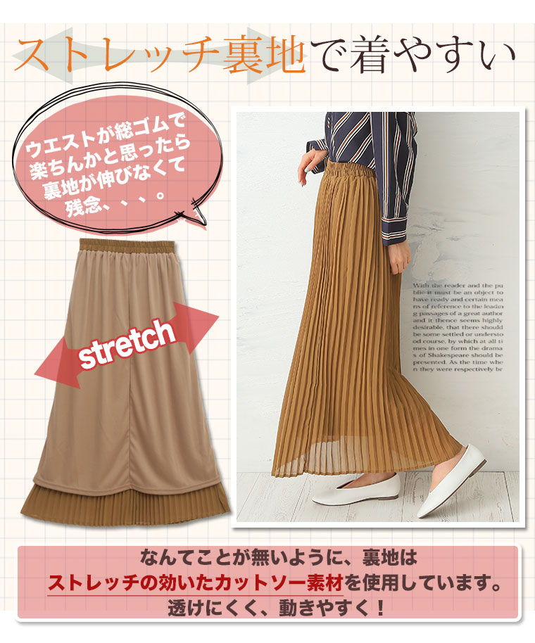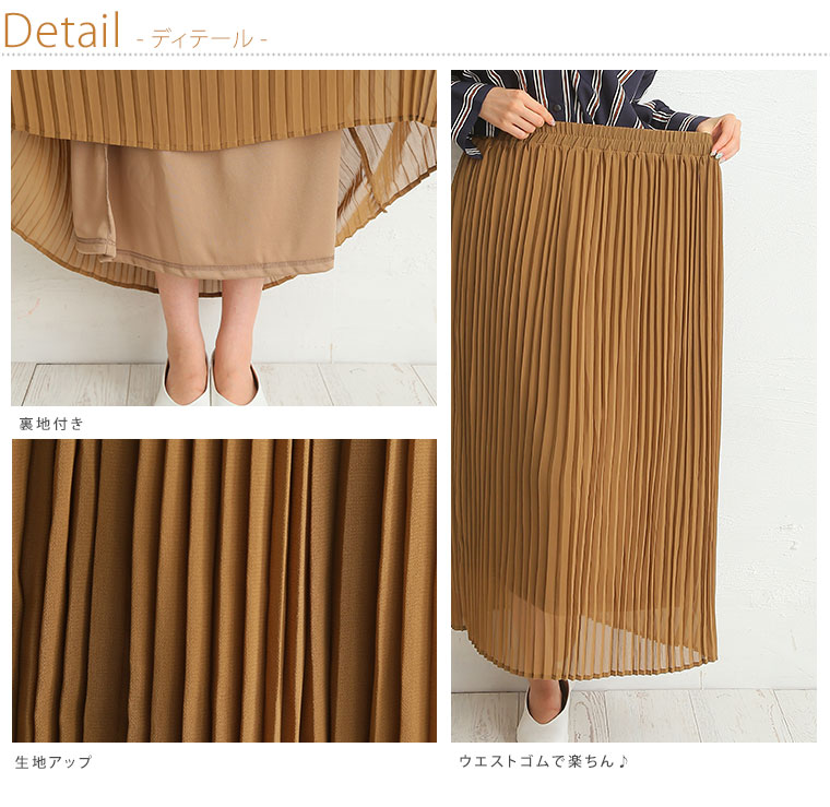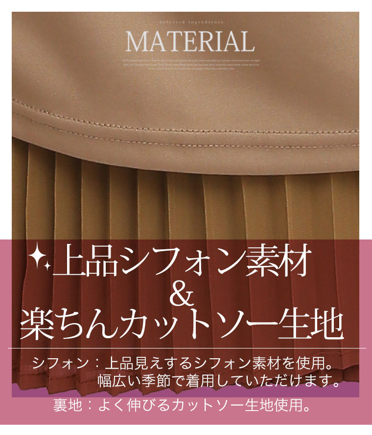 プリーツ加工でスッキリ細見え叶う。上品見えするするシフォン素材