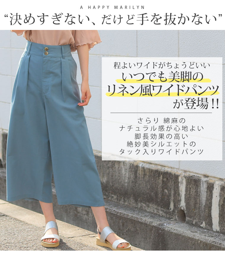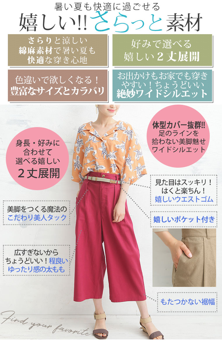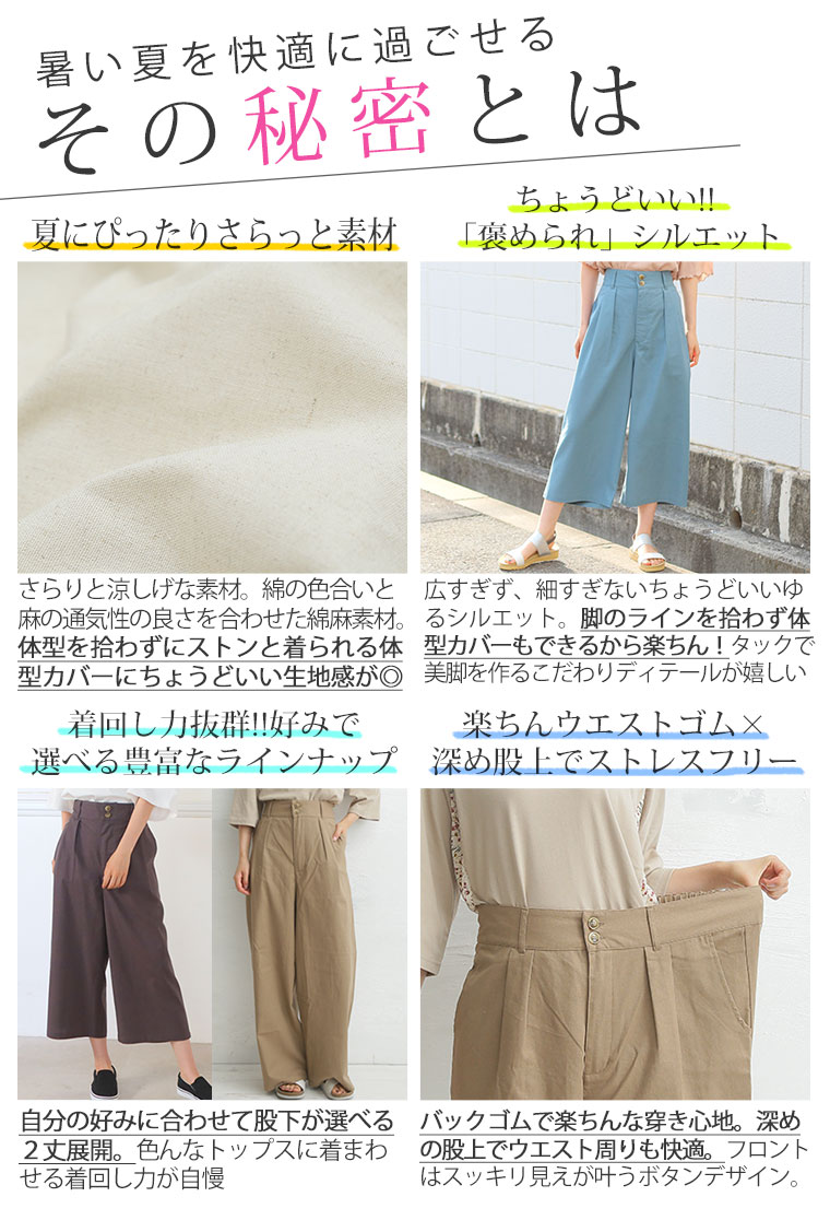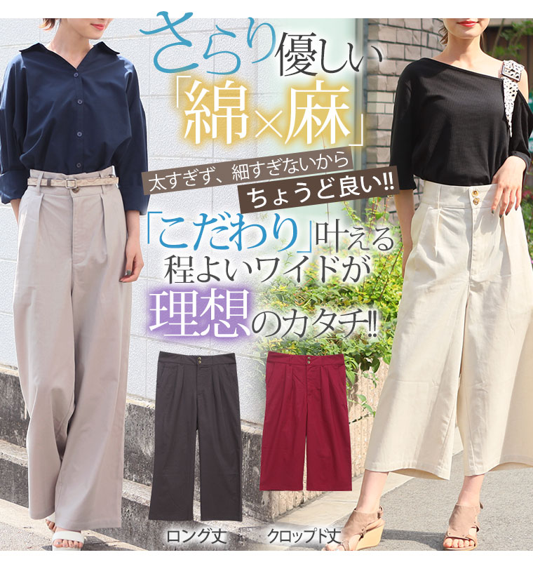 さらり心地よい嬉しい2丈!いつだって楽ちん美脚の綿麻ワイドパンツ