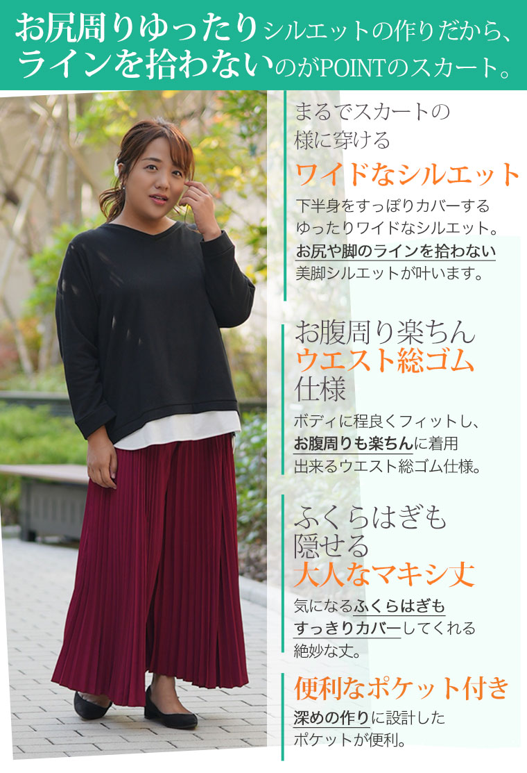 オリジナル ボトムス スカーチョ スカンツ ワイドパンツ LL 3L 4L 5L 6L 冬 冬物 冬服 ぽっちゃり ゆったり カジュアル ナチュラル 【ウェストゴム】 【hinaさん着用】身長別で丈が選べる プリーツ スカーチョ