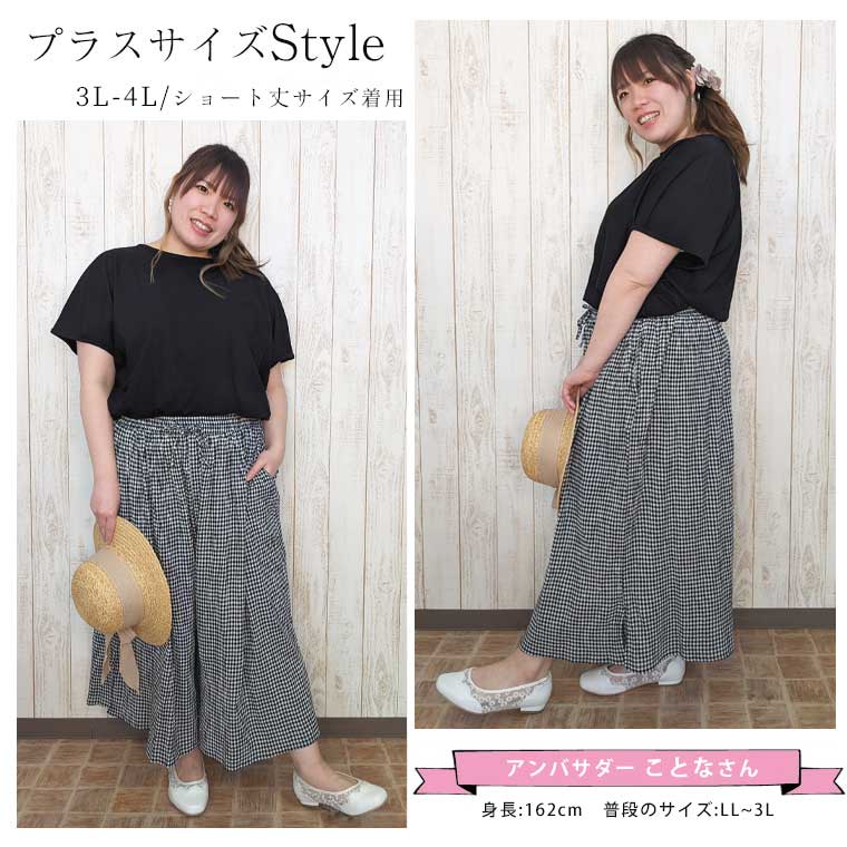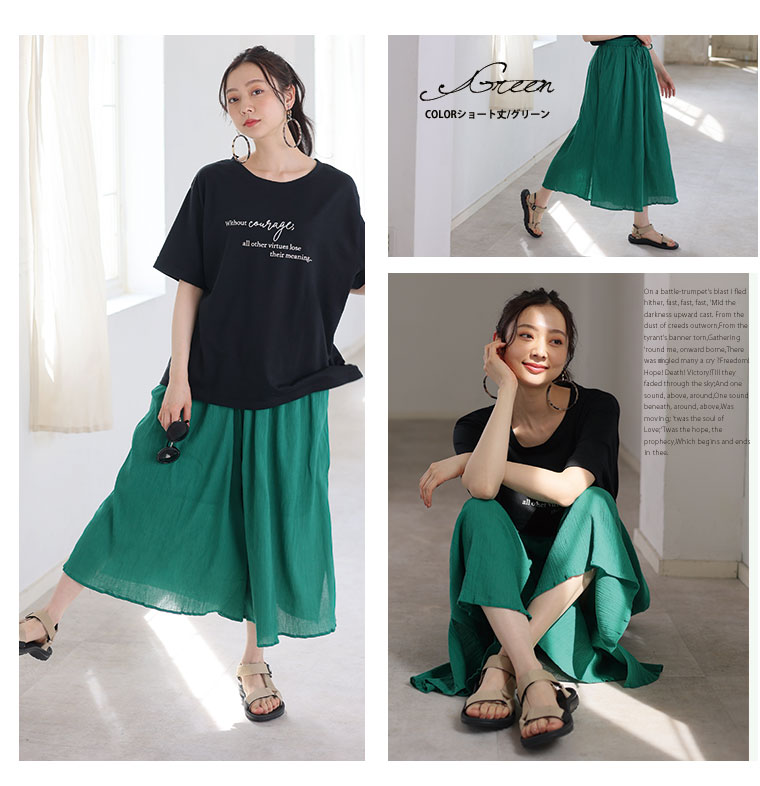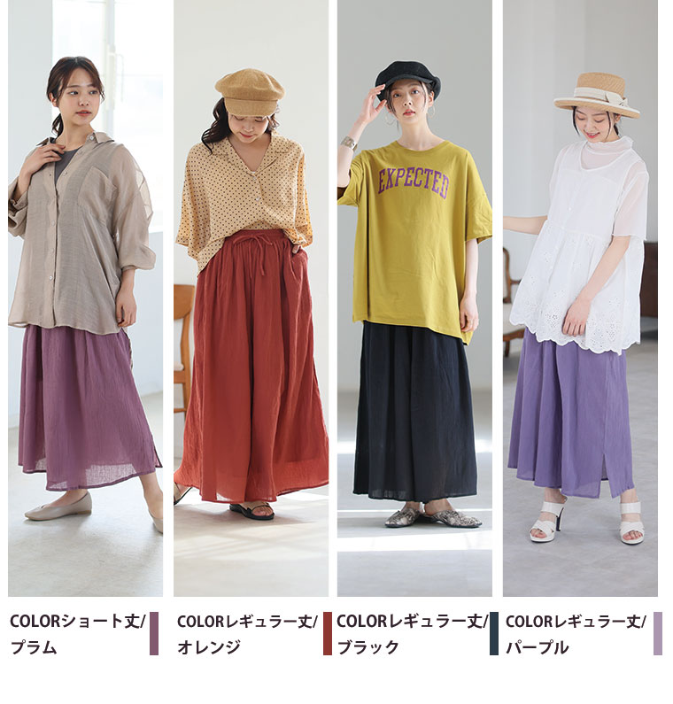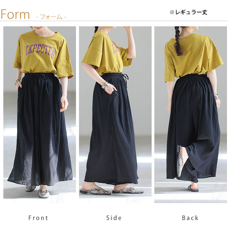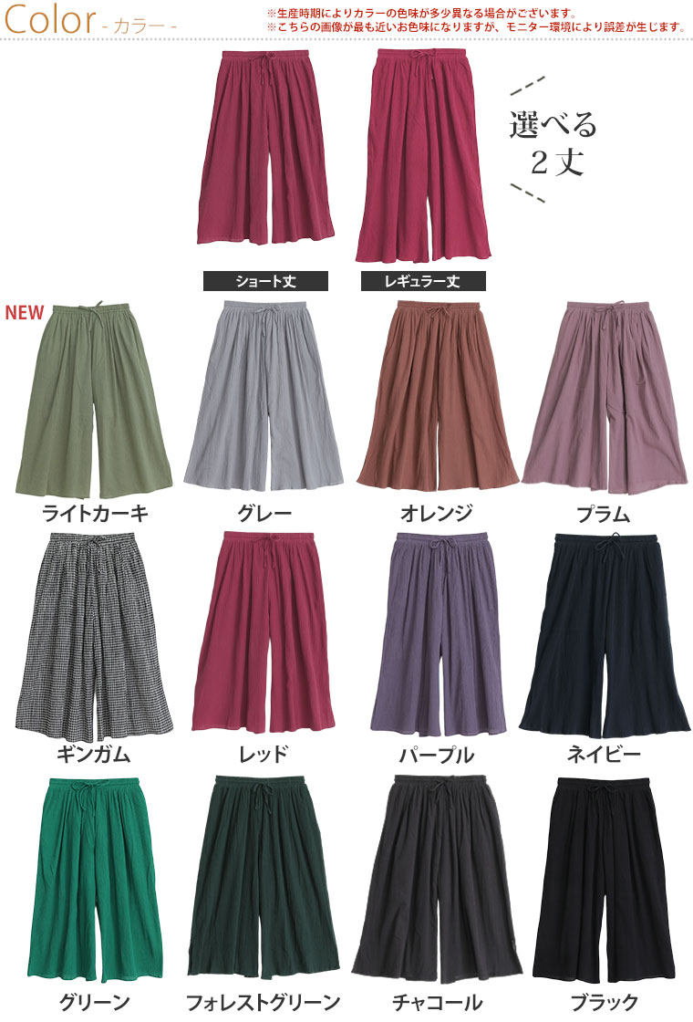 4. 大きいサイズ 新色追加!! 【風通るプレミアム】 2丈展開 綿 楊柳 ギャザー フレアスカンツ 【ウェストゴム】