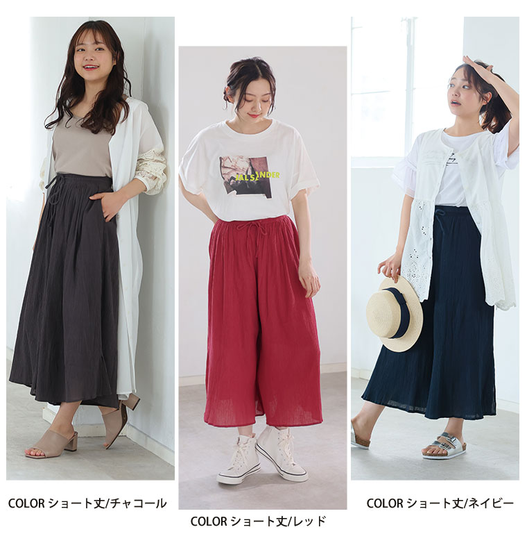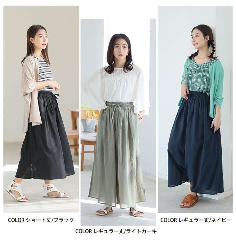3. 大きいサイズ 新色追加!! 【風通るプレミアム】 2丈展開 綿 楊柳 ギャザー フレアスカンツ 【ウェストゴム】