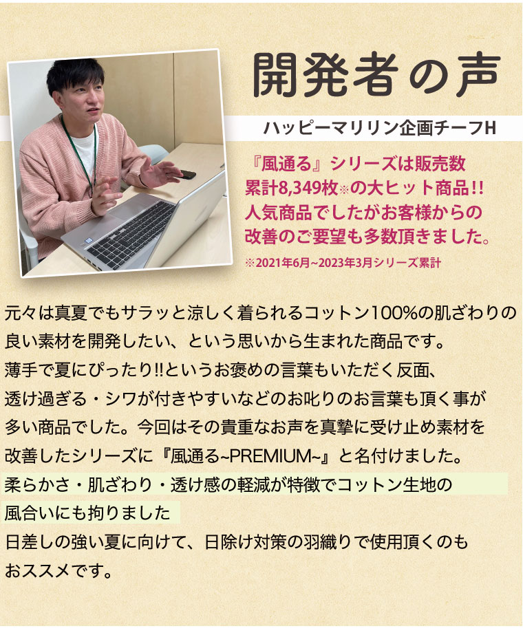 涼しくて履きやすいが、出先のトイレで上手くしないとサラサラしてるから油断すると床につきそうになり焦った。