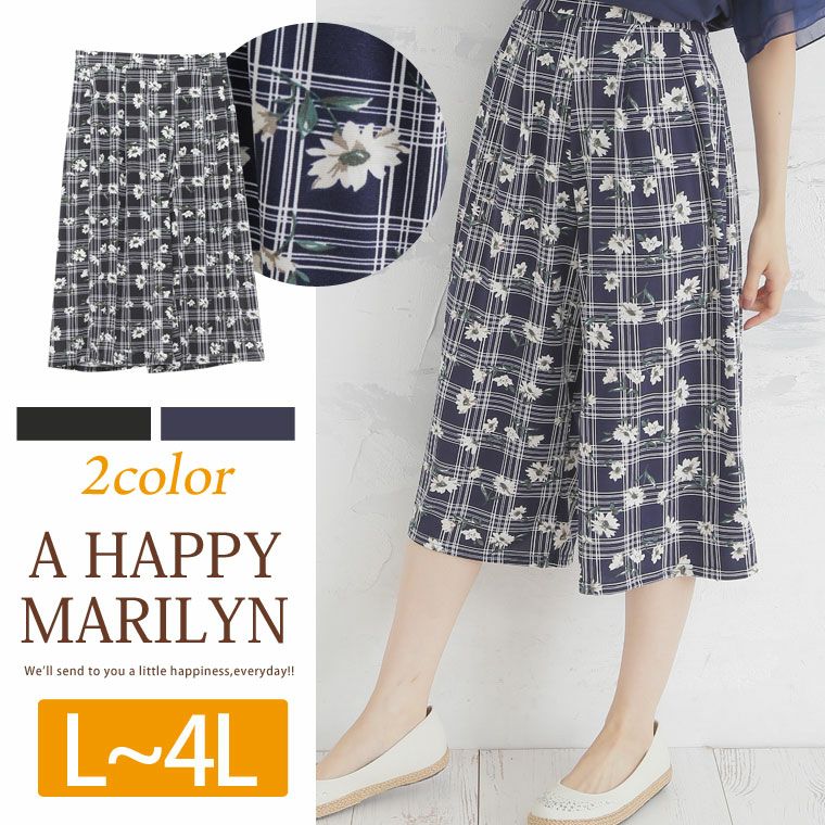 チェック×花柄デザインで旬スタイルに!!ウエストゴムのガウチョパンツ