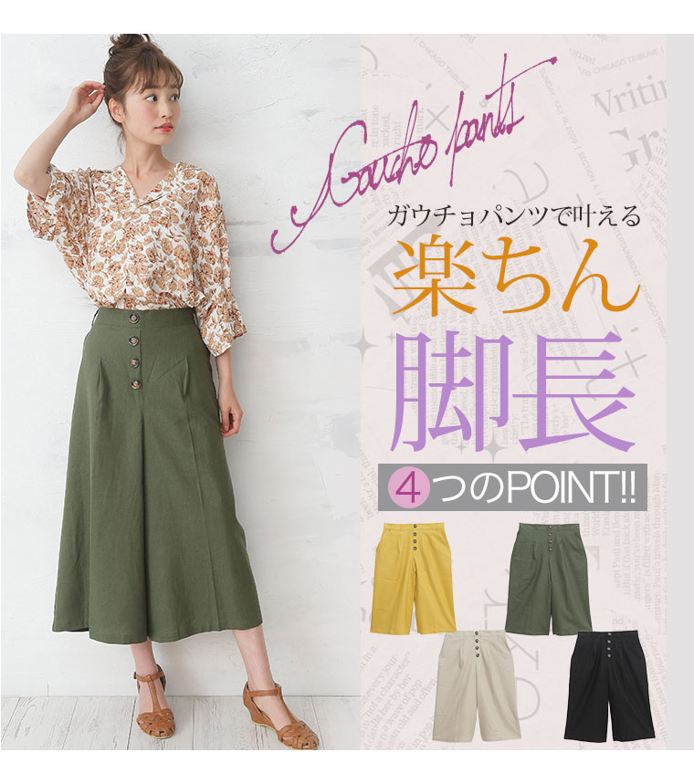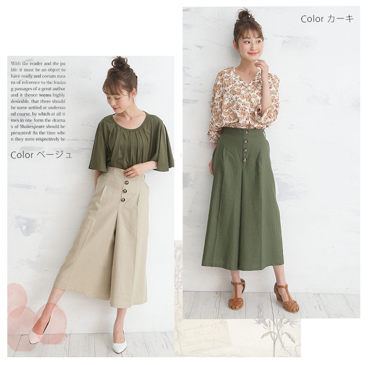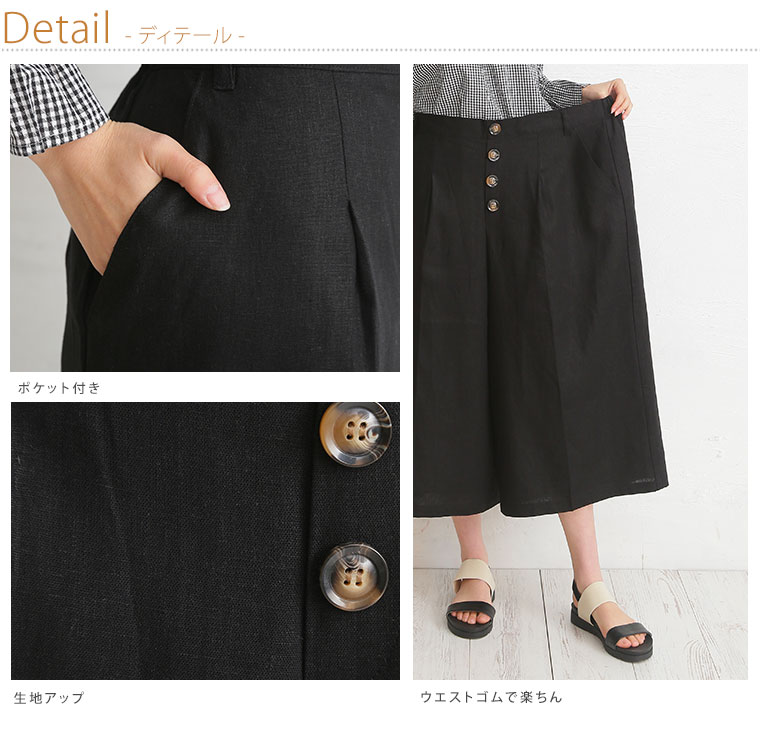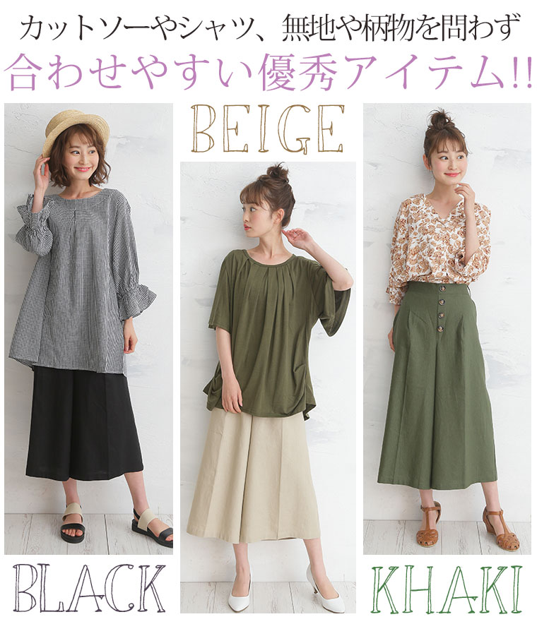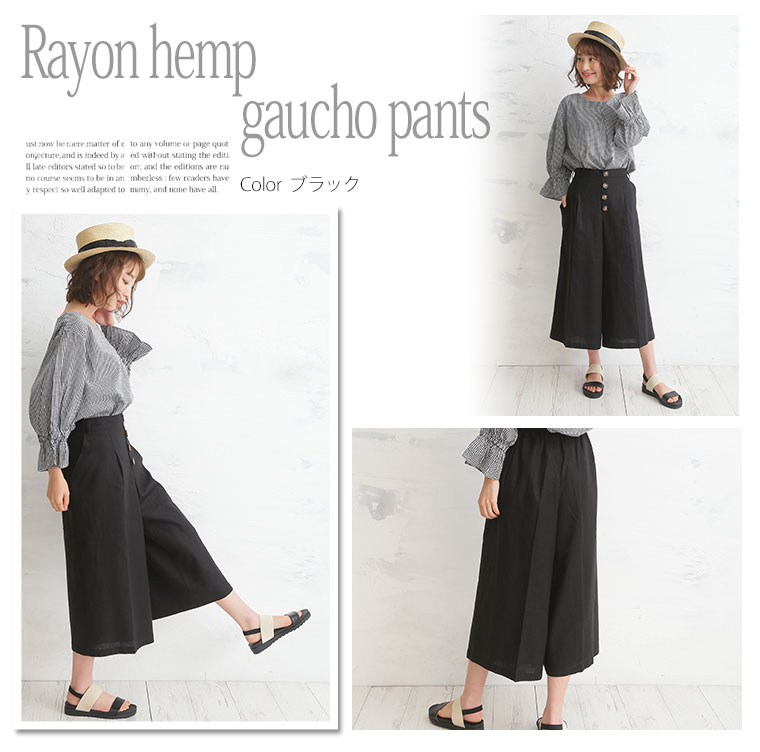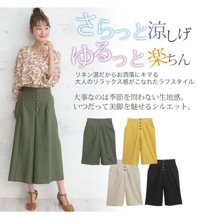 レーヨン麻で涼し気な素材。タック膝下ガウチョパンツ