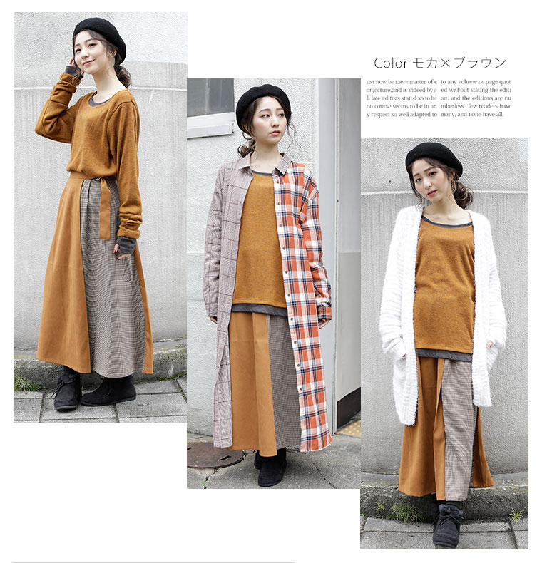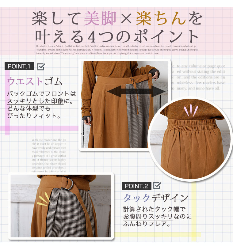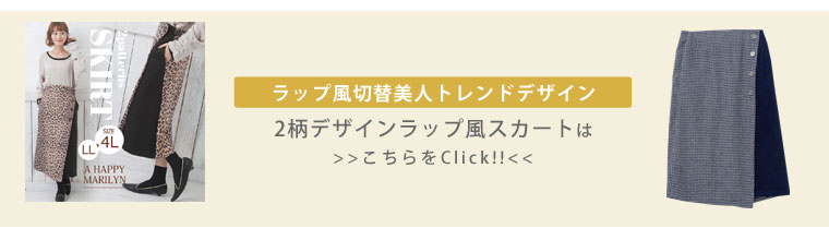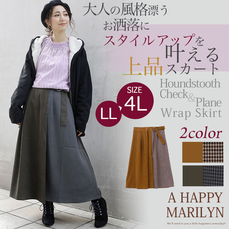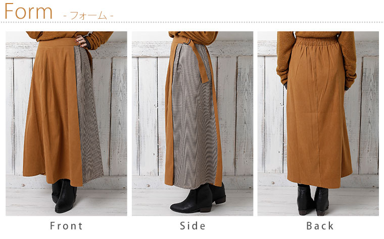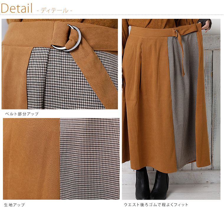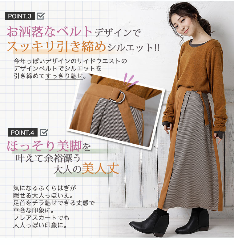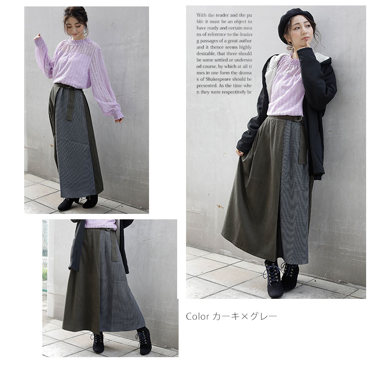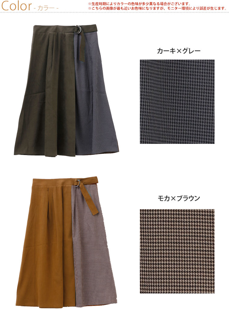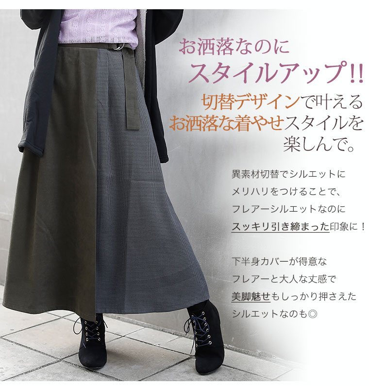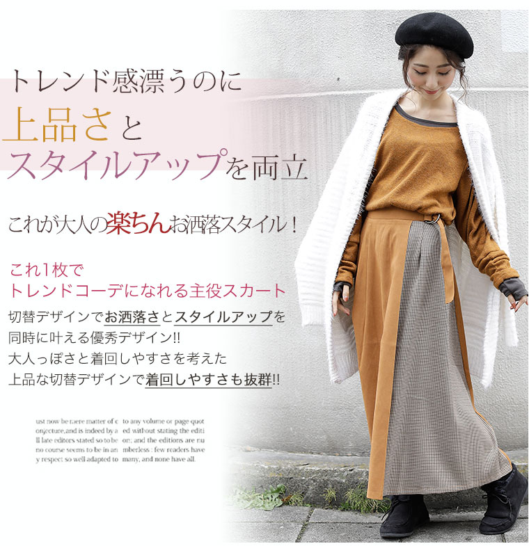 無地×千鳥柄の異素材切替がお洒落!ラップ膝下フレアスカート