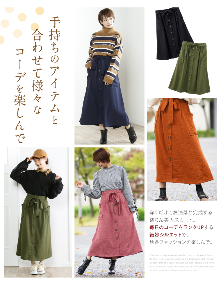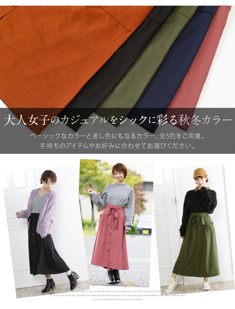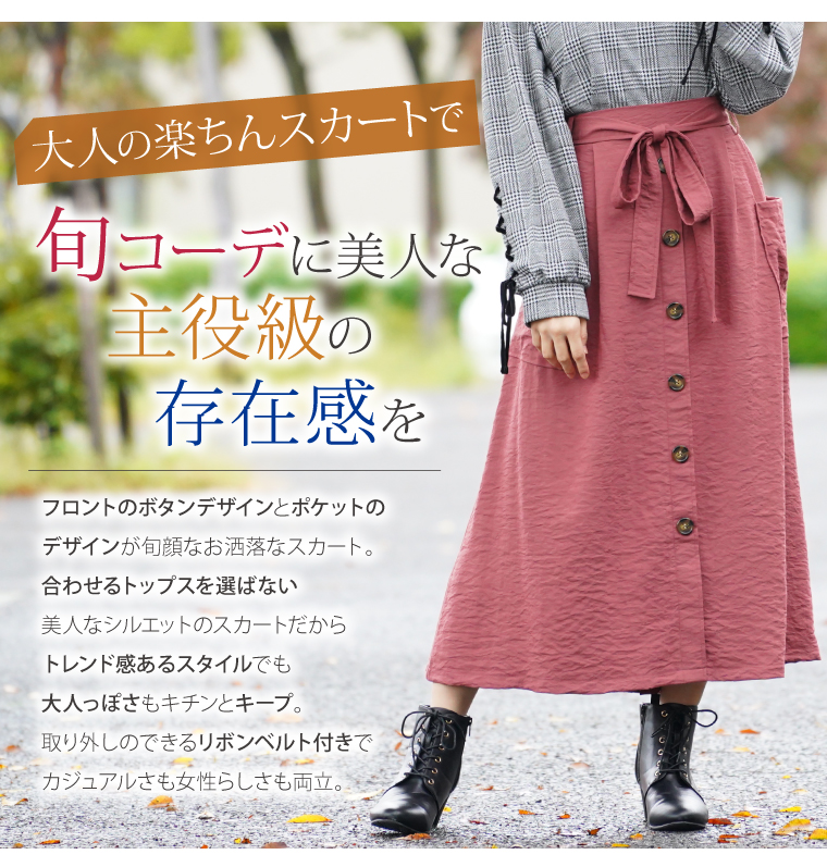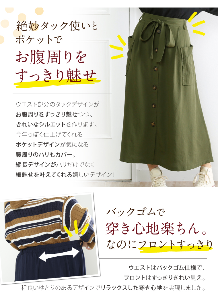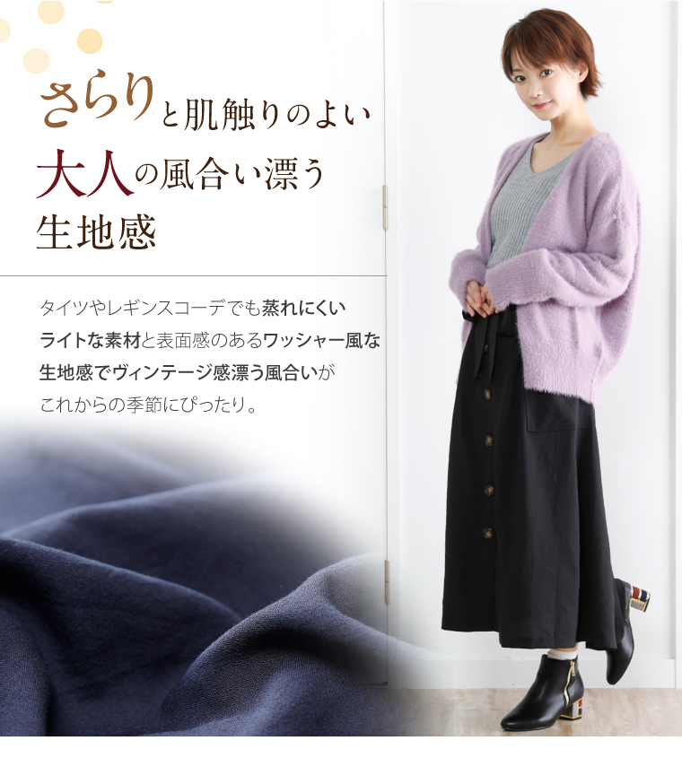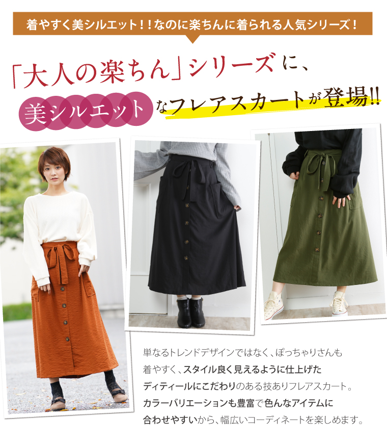ウエストゴムでゆったりした穿き心地。大人の楽ちん美人スカートです