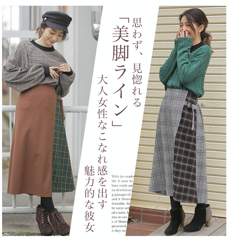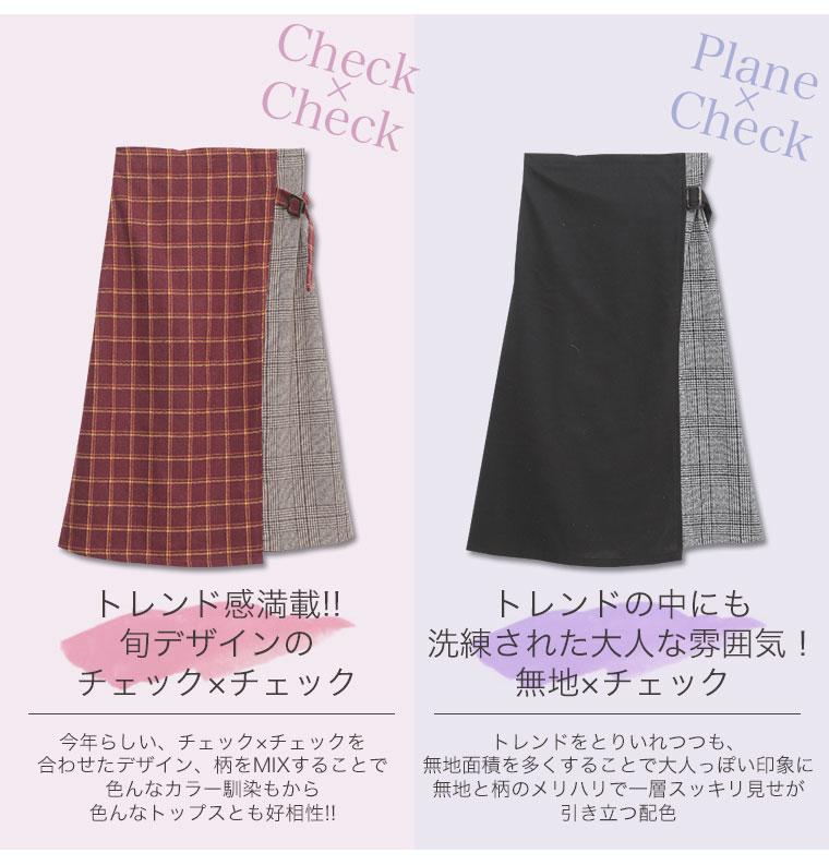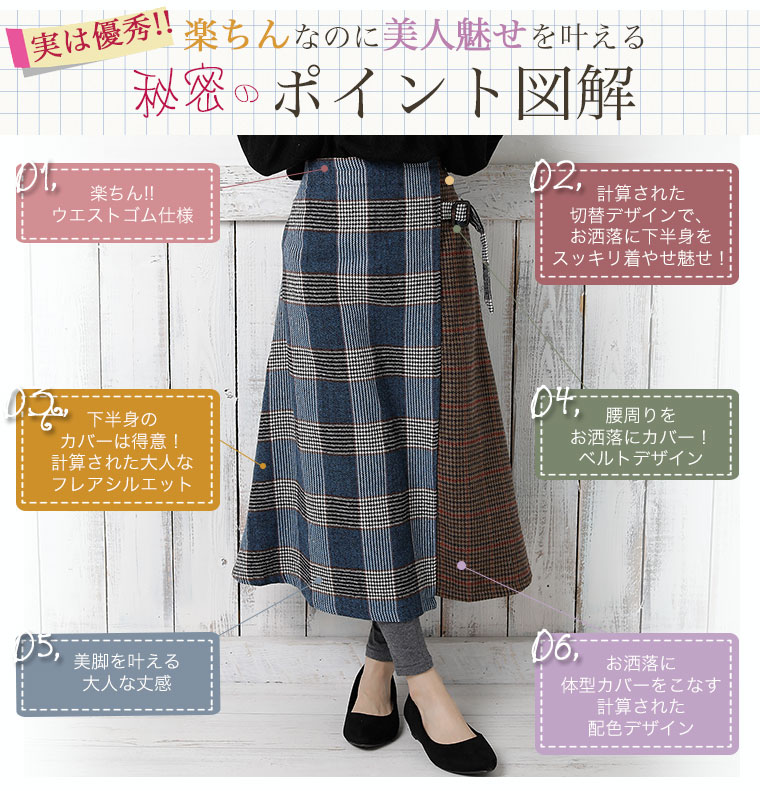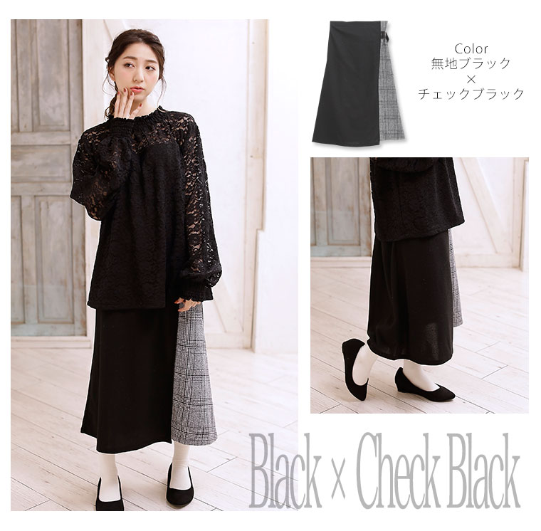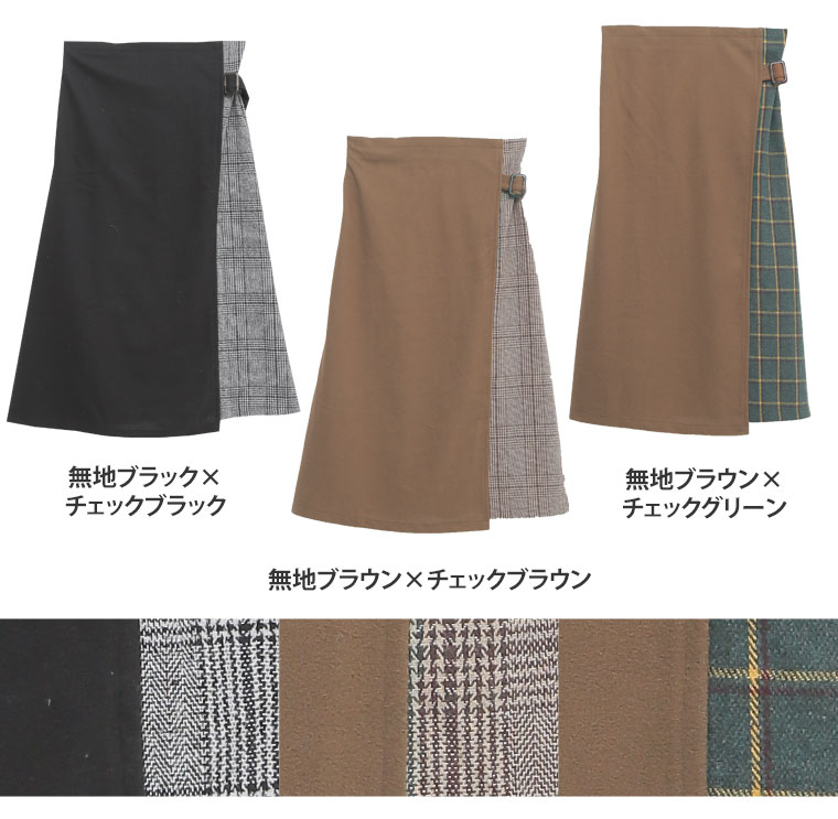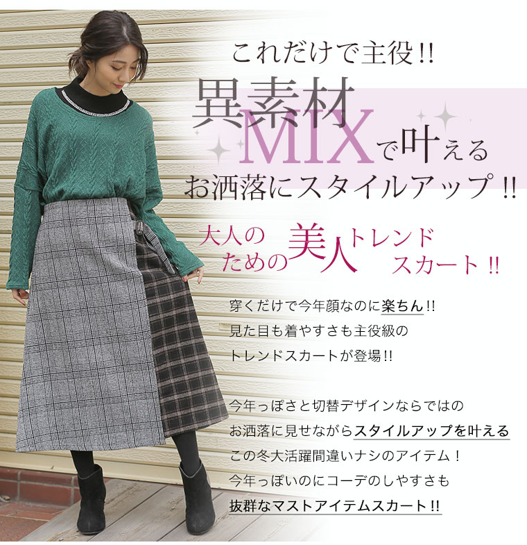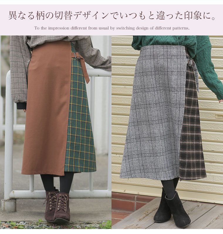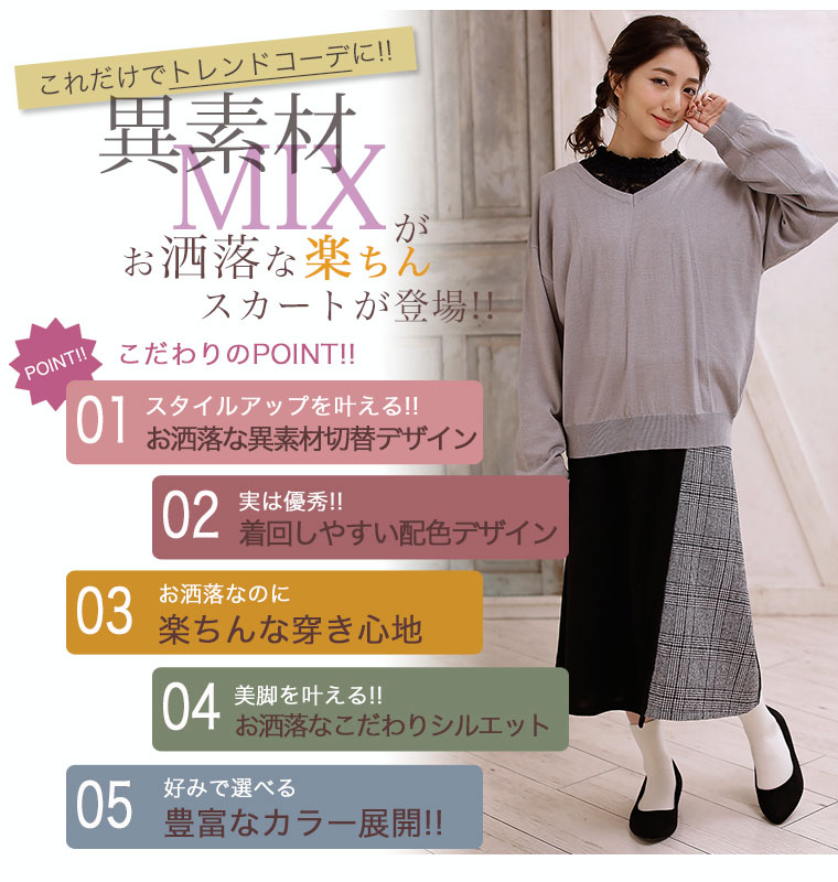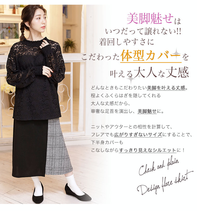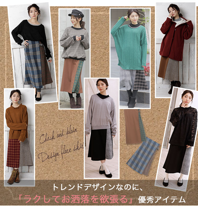 異素材切替と配色デザインがお洒落!!無地と柄から選べるフレアスカート