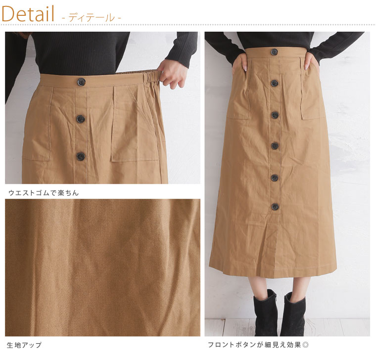 ウエスト後ろゴムでフロントはスッキリ!!程よい丈感で大人コーデの完成。