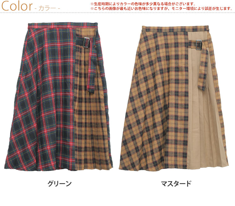 異なる生地のプリーツ切替えがポイント♪チェック柄膝下パッチワークフレアスカート