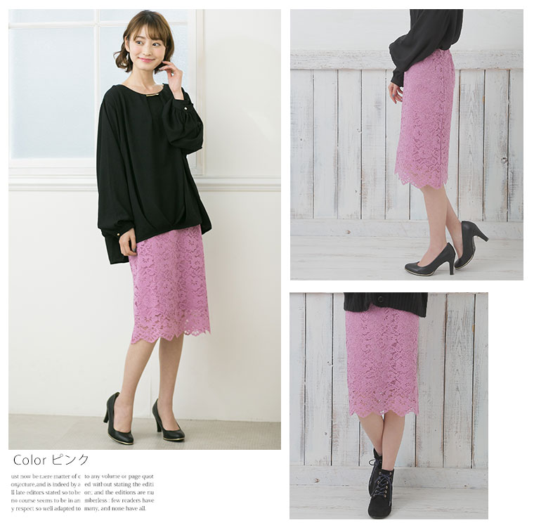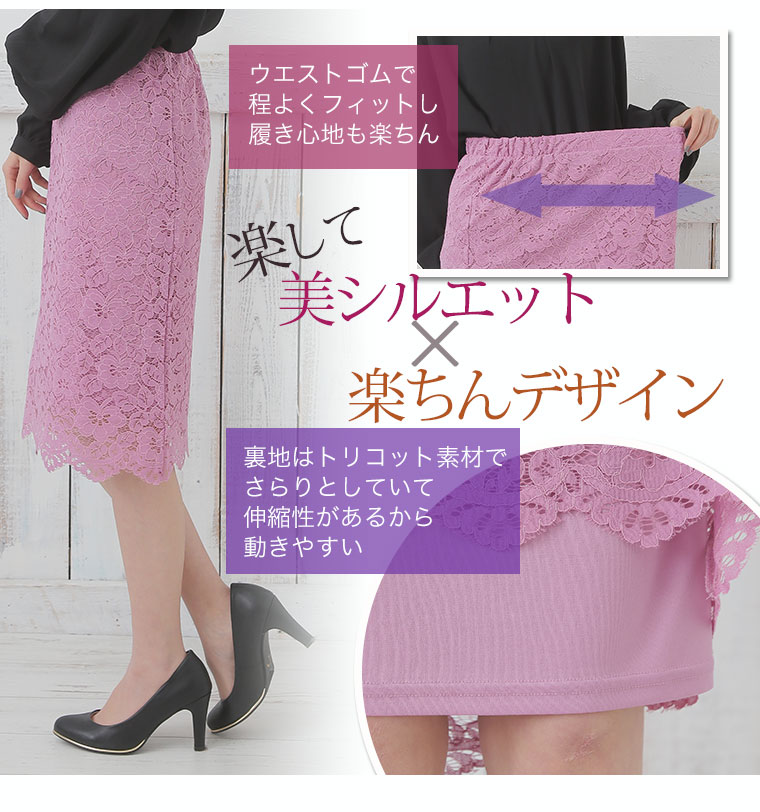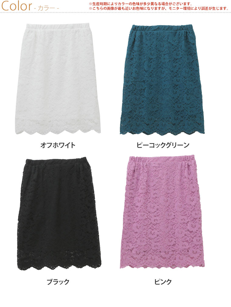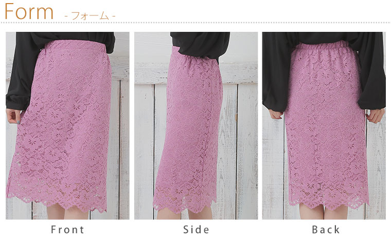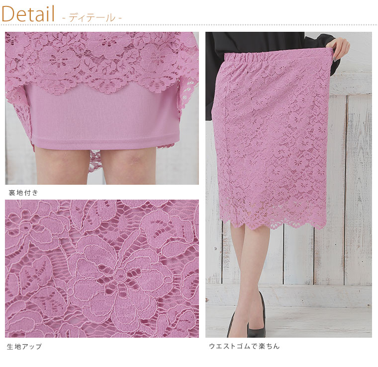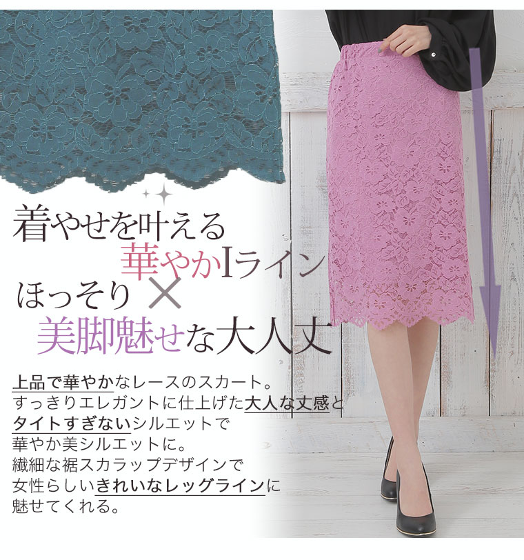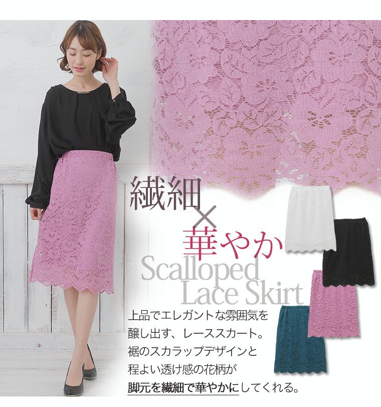 上品でエレガントな雰囲気の花柄レーススカラップ膝下丈タイトスカート