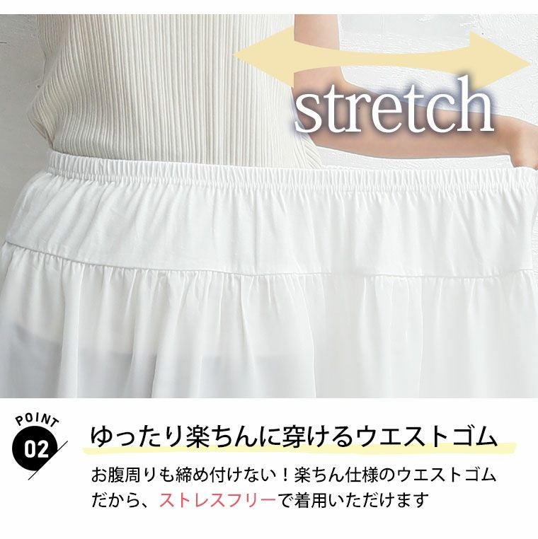 ミモレ丈とは、ふくらはぎの中間あたりのスカート丈のことで、マキシ丈よりも動きやすく、膝丈よりも落ち着いた大人の雰囲気を出せるのがポイントです。カジュアルになりすぎず、レディー要素を取り入れられるので、デートやちょっとしたお出かけにもこなれ感が出てぴったりのアイテムです。マリリンではミモレ丈スカートはウエストゴムのアイテムがほとんどなので、楽チンなのにオシャレになれるというポイントからかなりの人気アイテムとなっています。オールシーズン着用でき、どんなアイテムとも相性抜群!トレンドの靴下合わせのコーディネートはミモレ丈のスカートで合わせるのが一番こなれ感が出て、オシャレに見えること間違いなしです。トップスはインするのがスッキリみえるのでオススメです。柄トップスやショート丈のアイテムとも相性がよく、スカートに色物を合わせるのも一気に華やかになるので、カラーを取り入れるのが難しいと思っている方には是非試して頂きたいです。足首が見える丈間なので、細見えももちろんのことブーツやスニーカーと合わせても可愛いので、スカートが苦手な方でもミモレ丈スカートは楽チンで可愛くなるのでオススメしたいアイテムです。