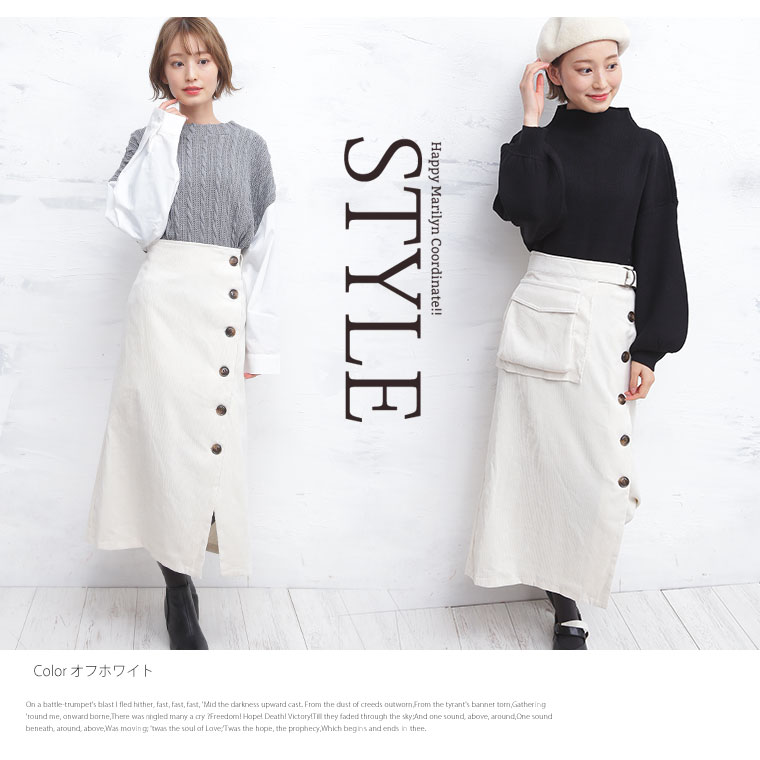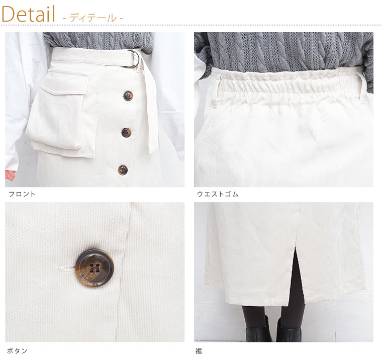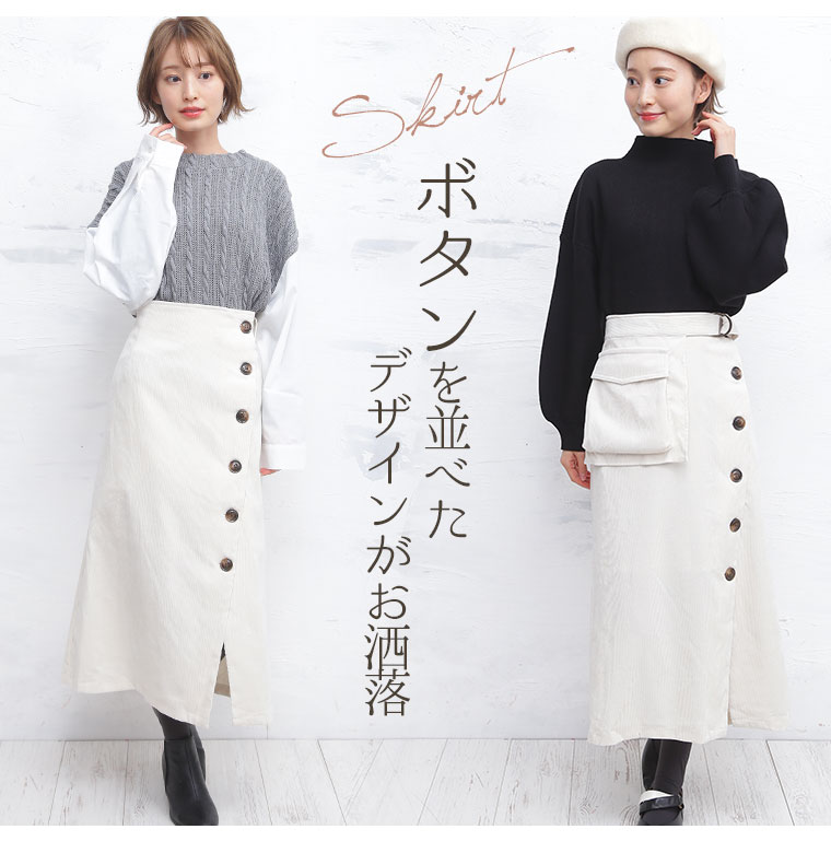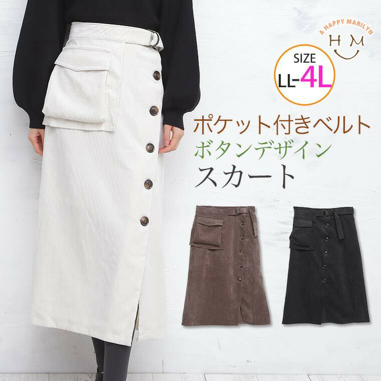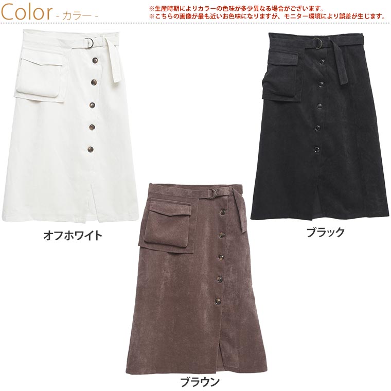 ボタンを並べたデザインがお洒落なポケット付きベルトスカート