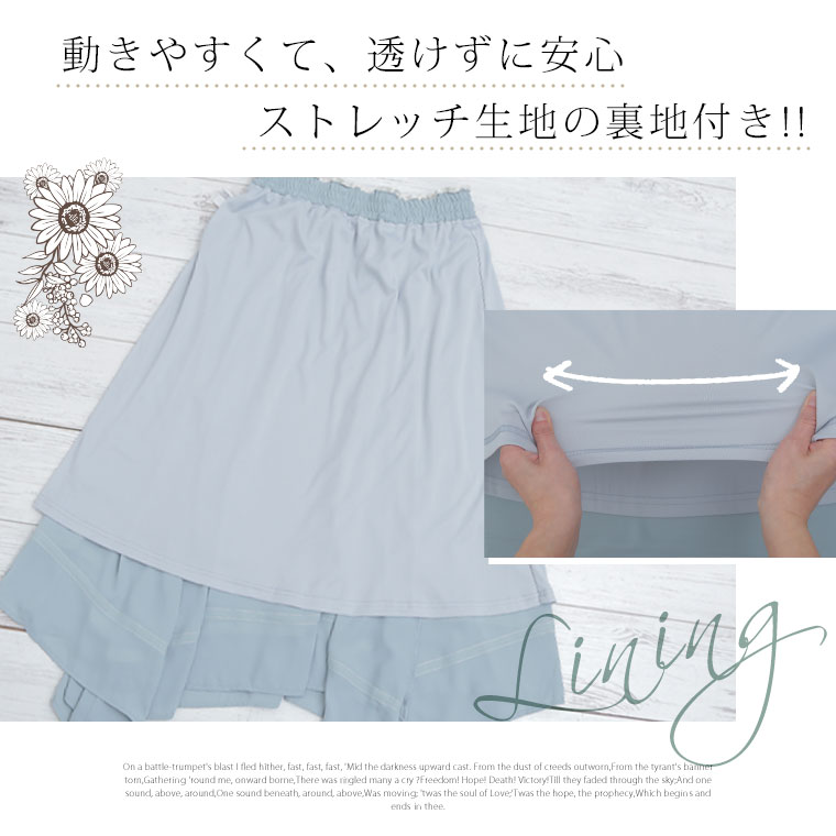 サイズ単位:cm 総丈(長/短/裏地) ウエスト ヒップ(裏地) 裾周り/裏地 素材/透け感