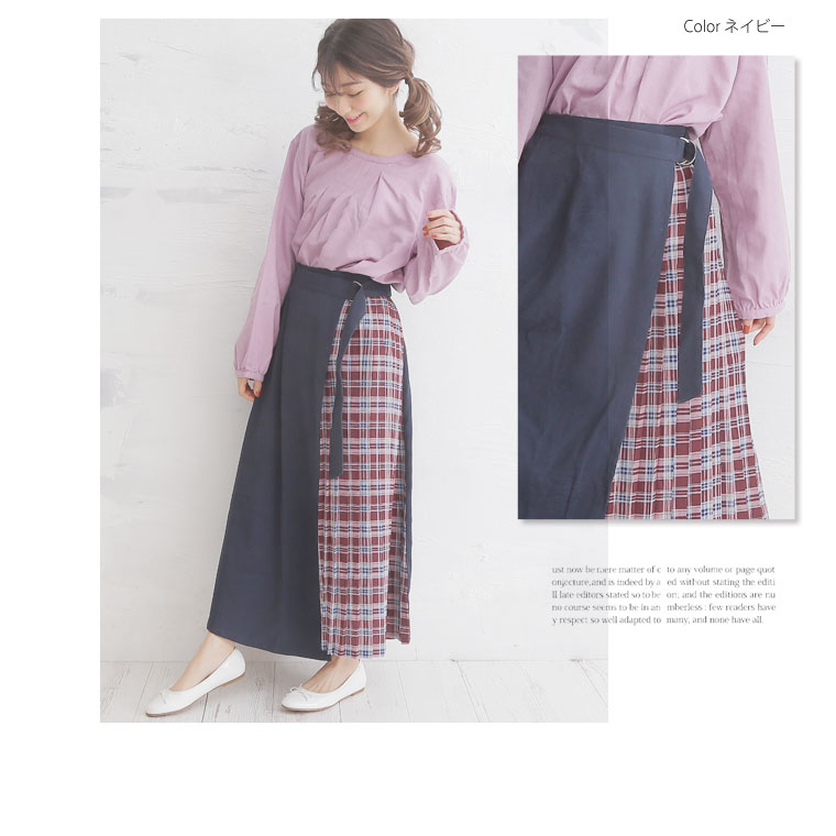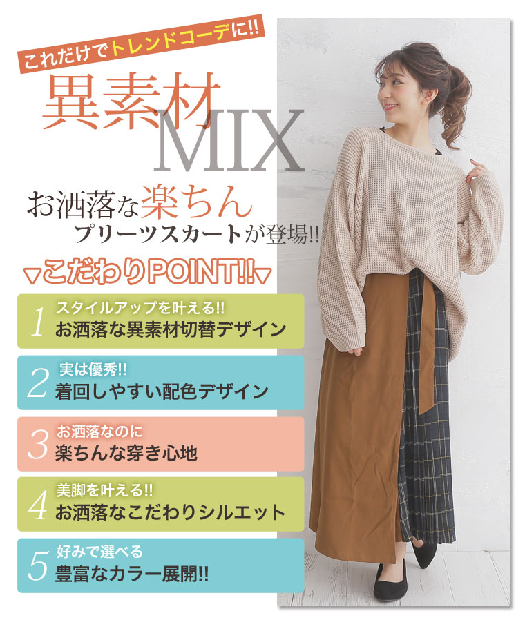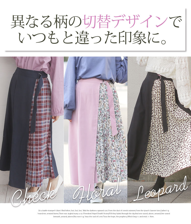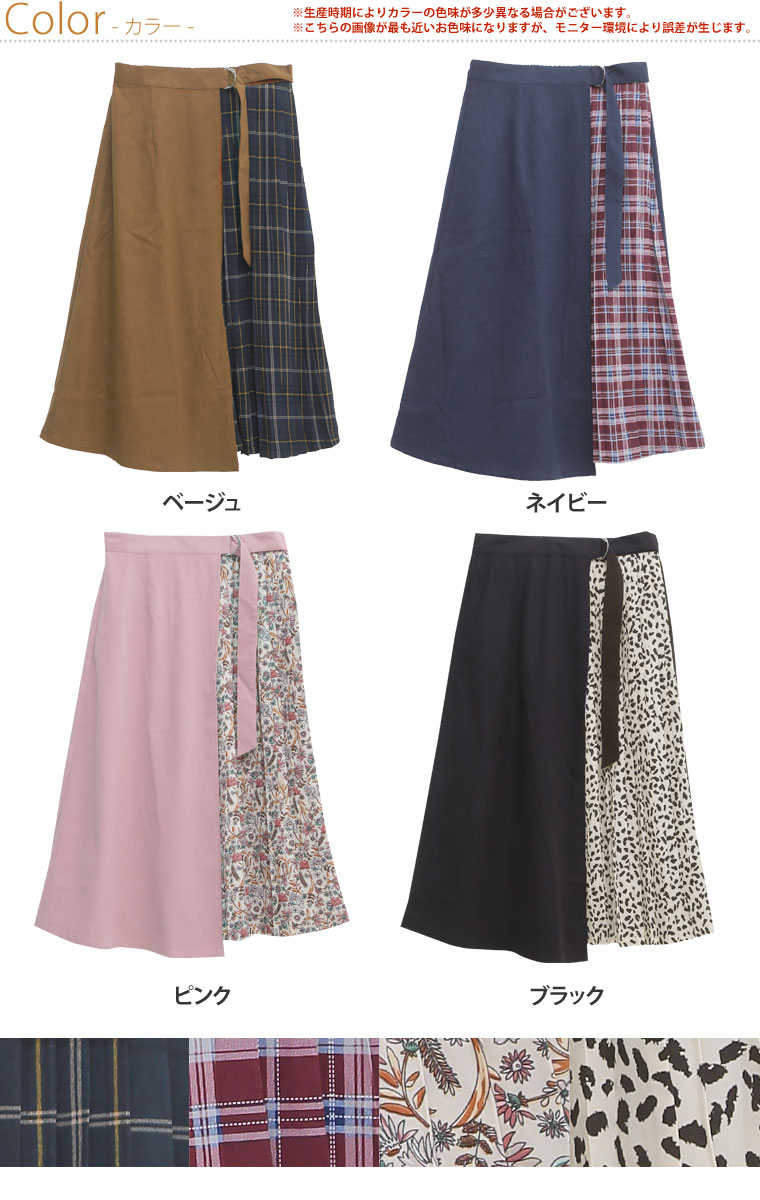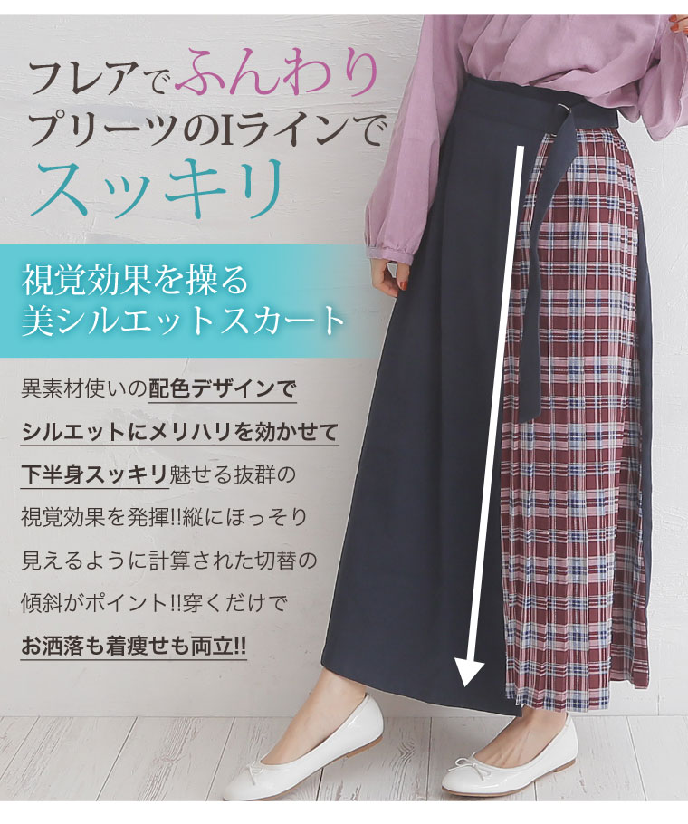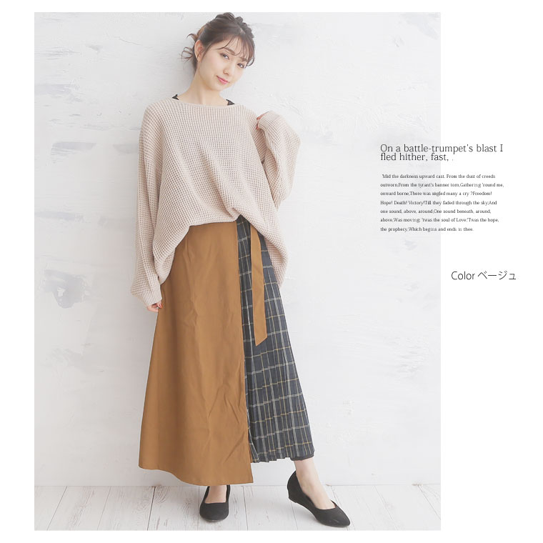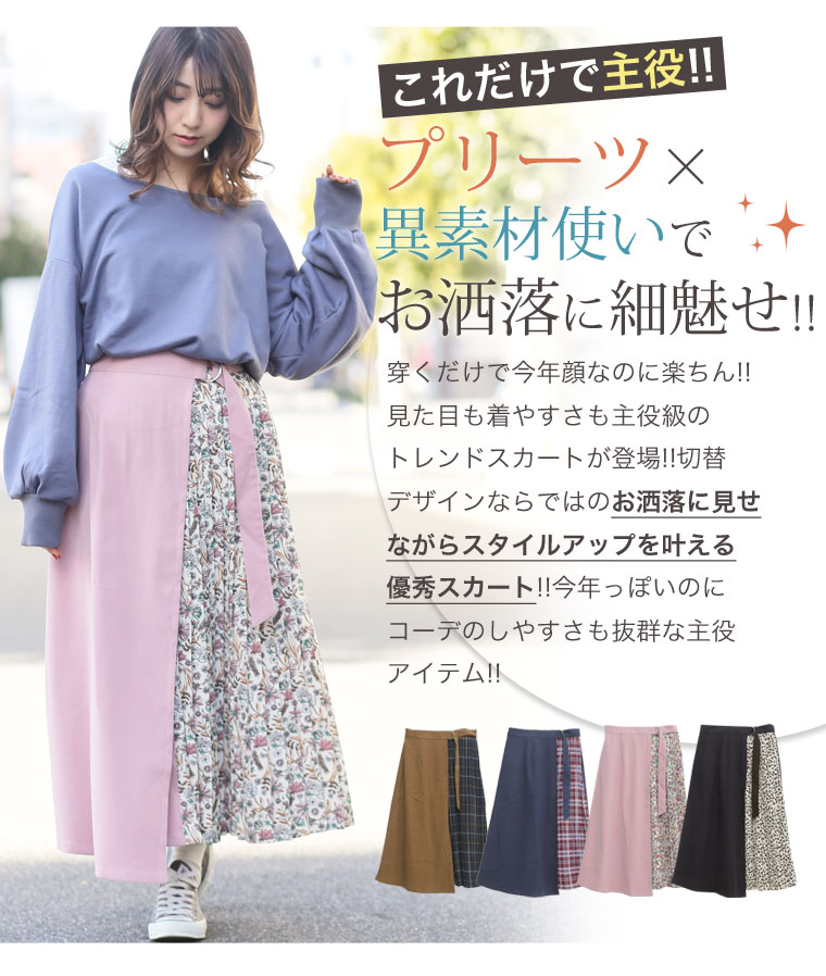無地×柄の配色切り替えでバランスよく。ラップ風プリーツスカート