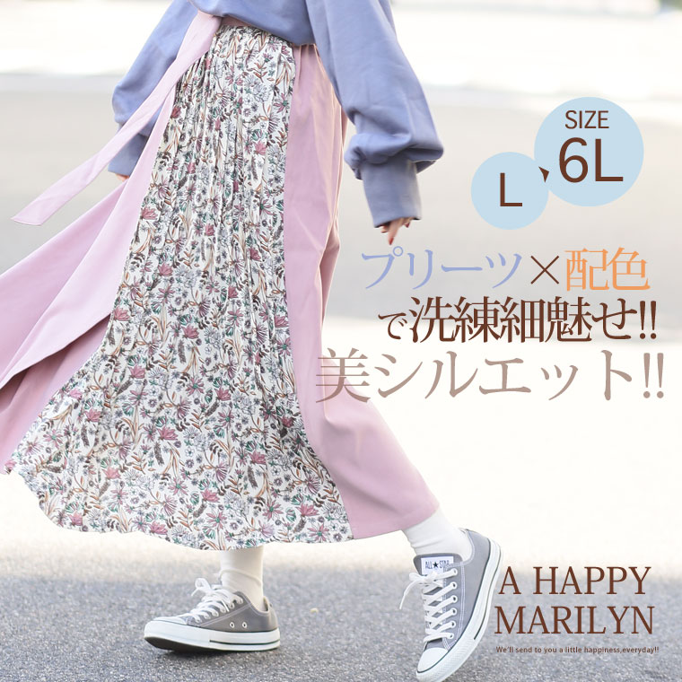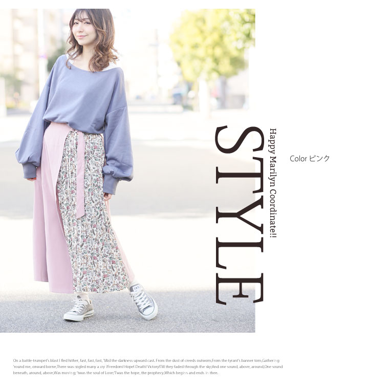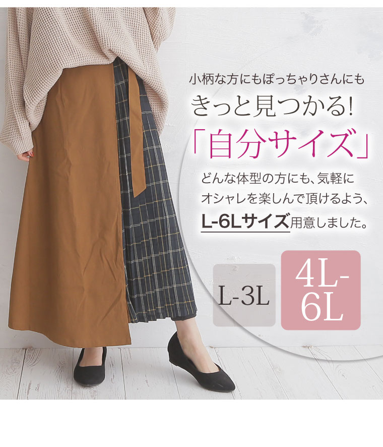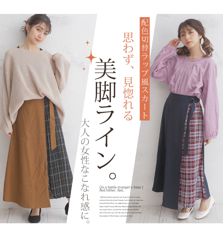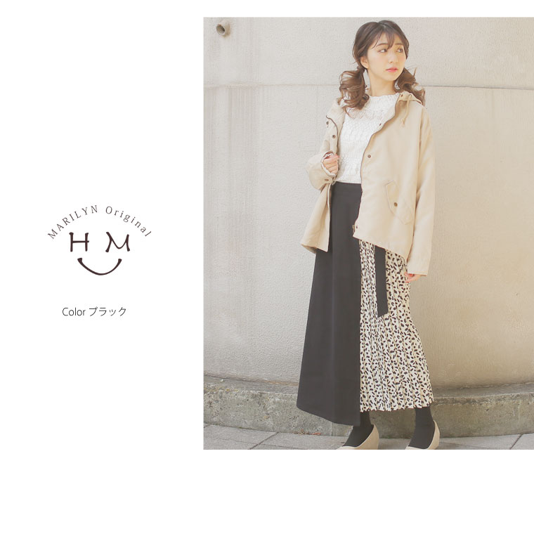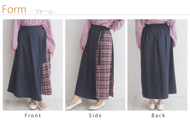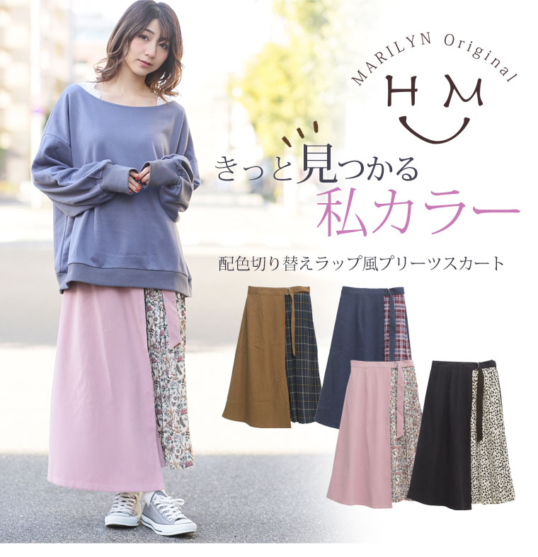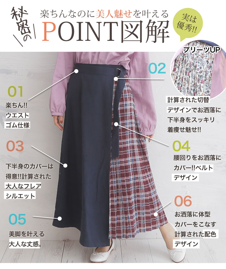 無地×柄の配色切り替えでバランスよく。ラップ風プリーツスカート