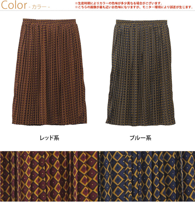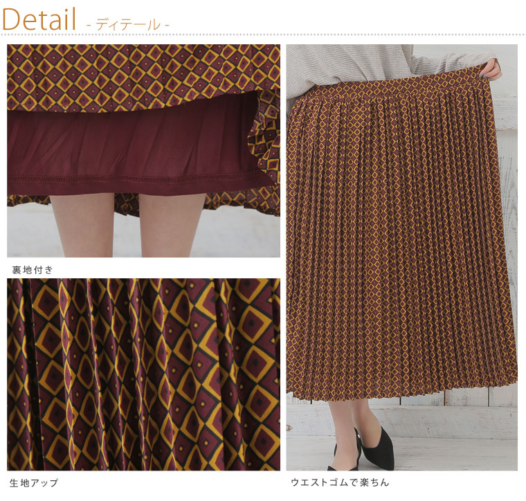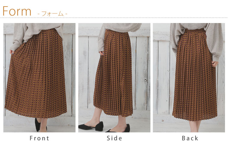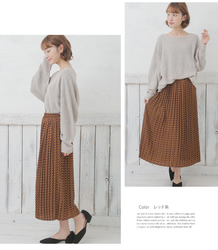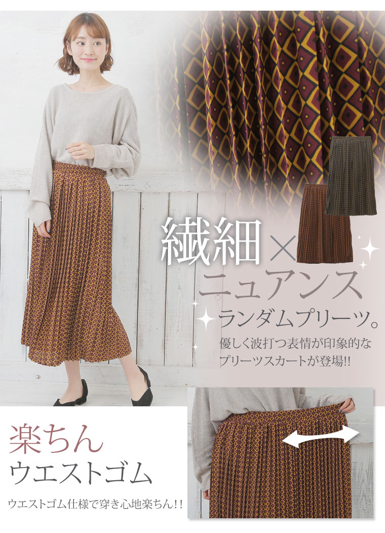 大人っぽい小紋柄がレトロな印象に。プリントプリーツスカート