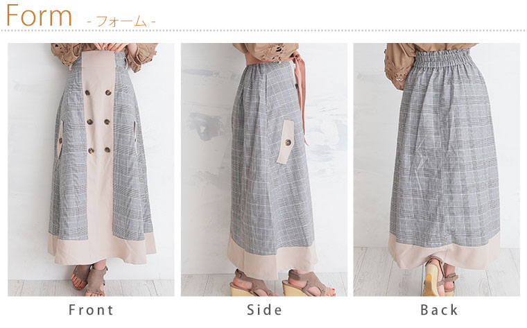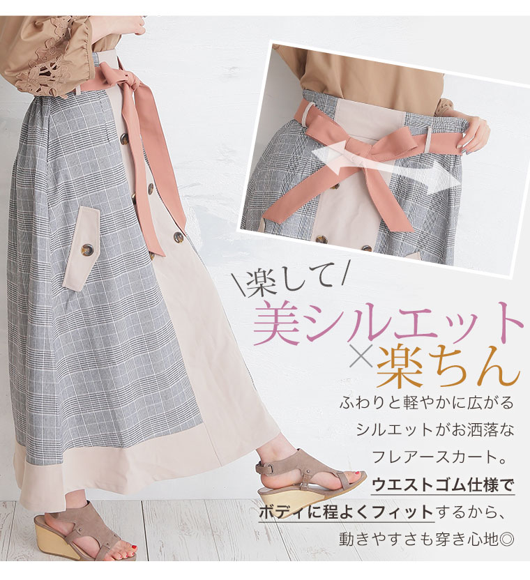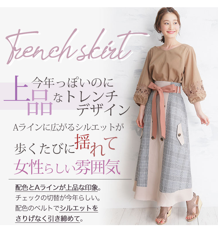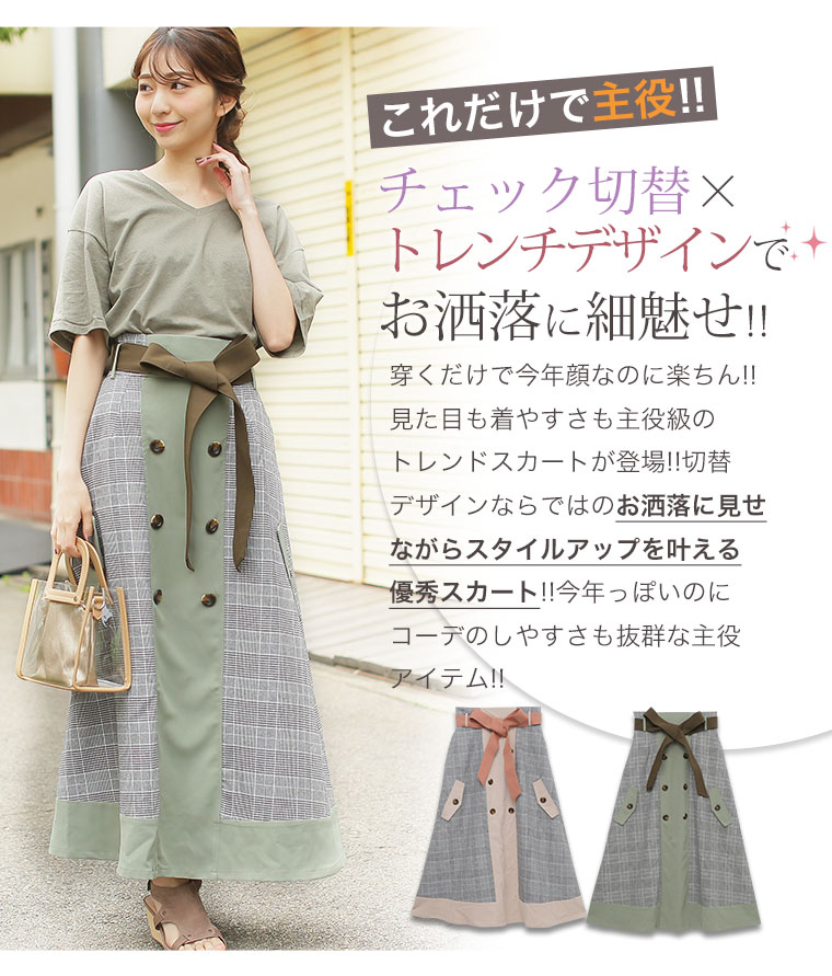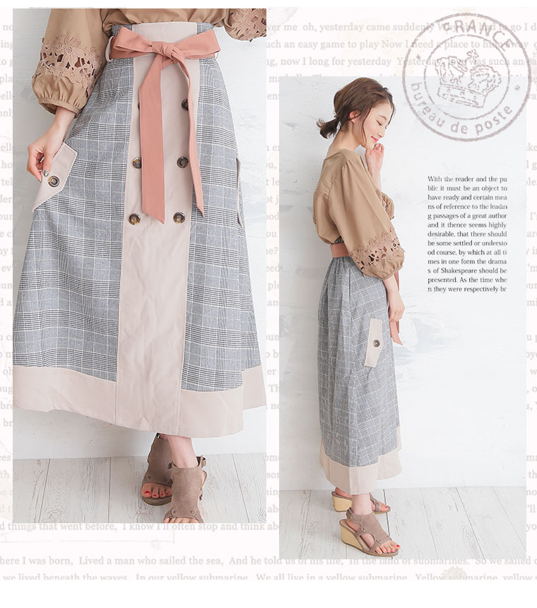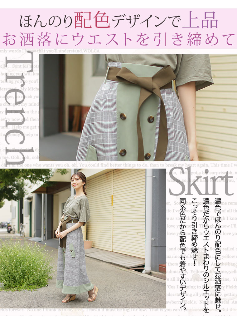 無地×グレンチェック切替配色リボンウエストベルトトレンチスカート