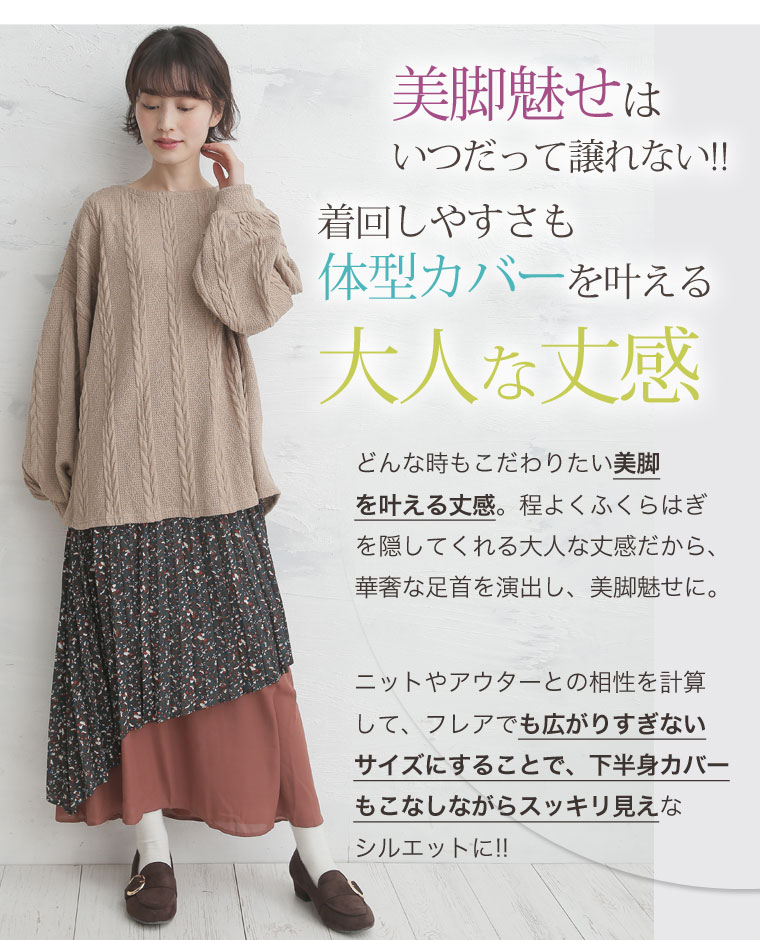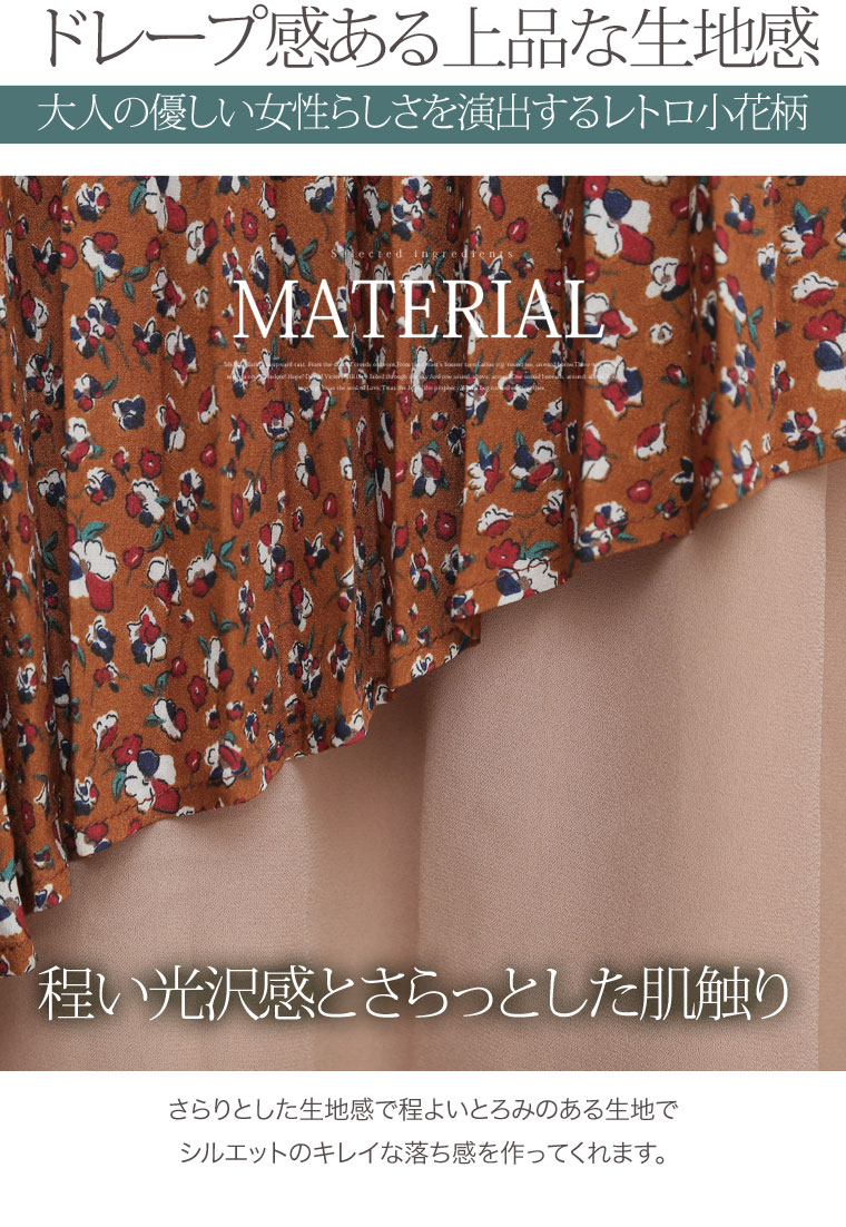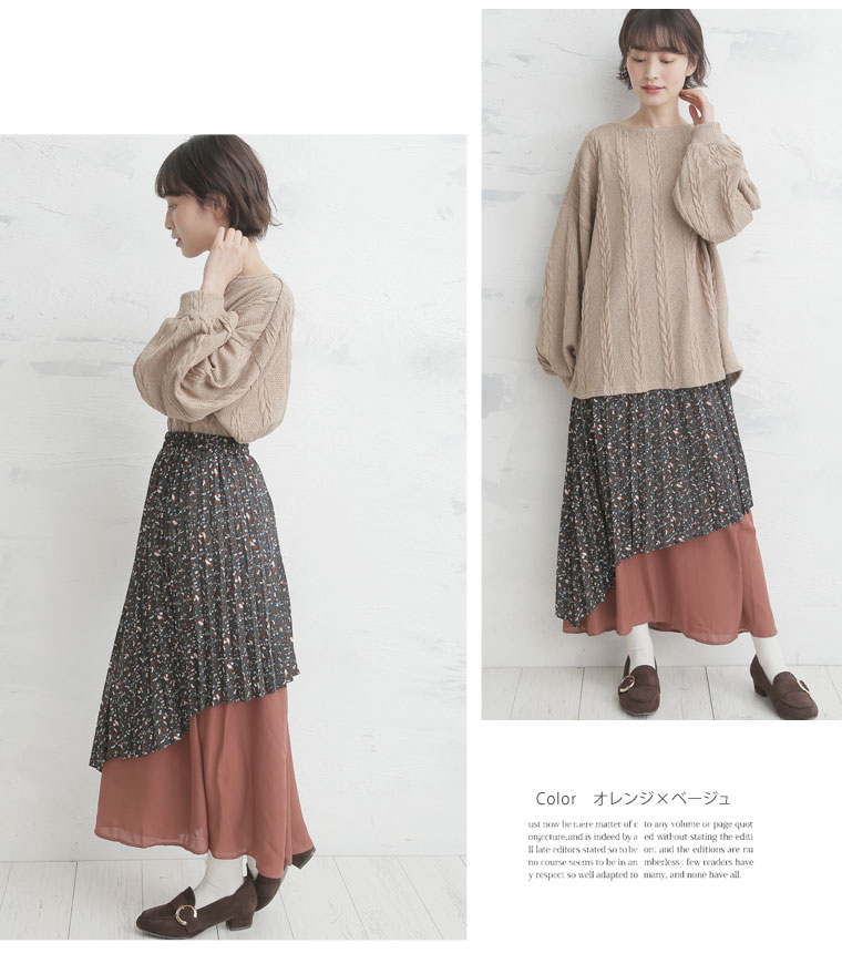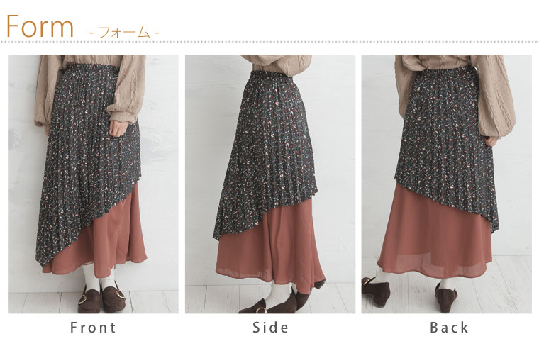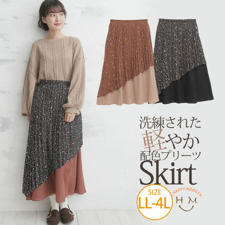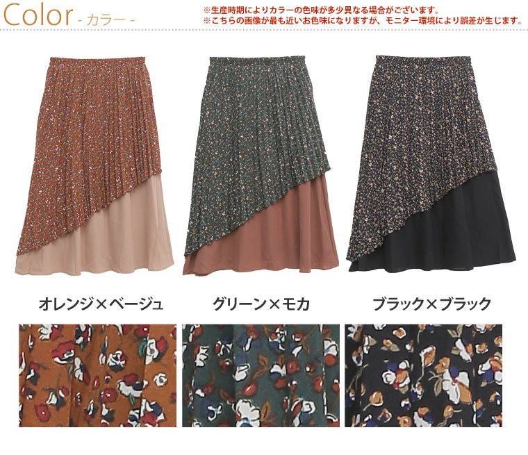 アシンメトリーデザインで軽やかに着こなす!!配色プリーツ花柄スカート