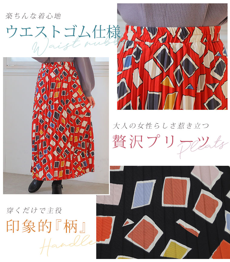 プリーツスカート ボトムス LL 3L 4L 春 春物 春服 ぽっちゃり ゆったり かわいい デシン 幾何学柄プリント 85丈 アコーディオンプリーツ スカート
