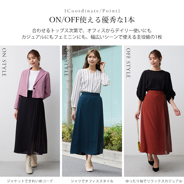 サイズ単位:cm 総丈/裏地 ウエスト ヒップ(プリーツ閉じて) 裾周り(プリーツ閉じて) 素材/透け感