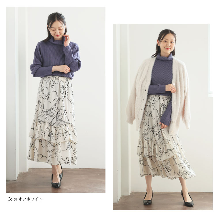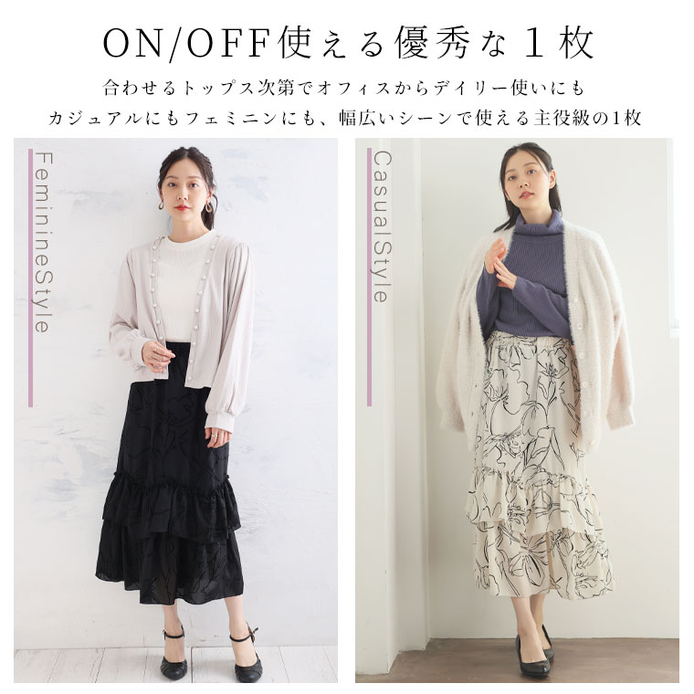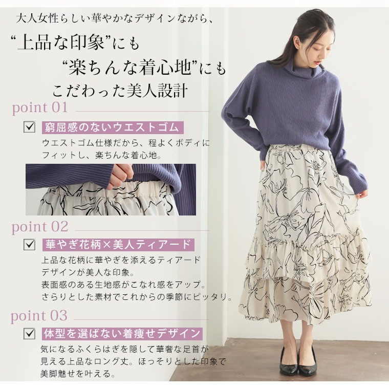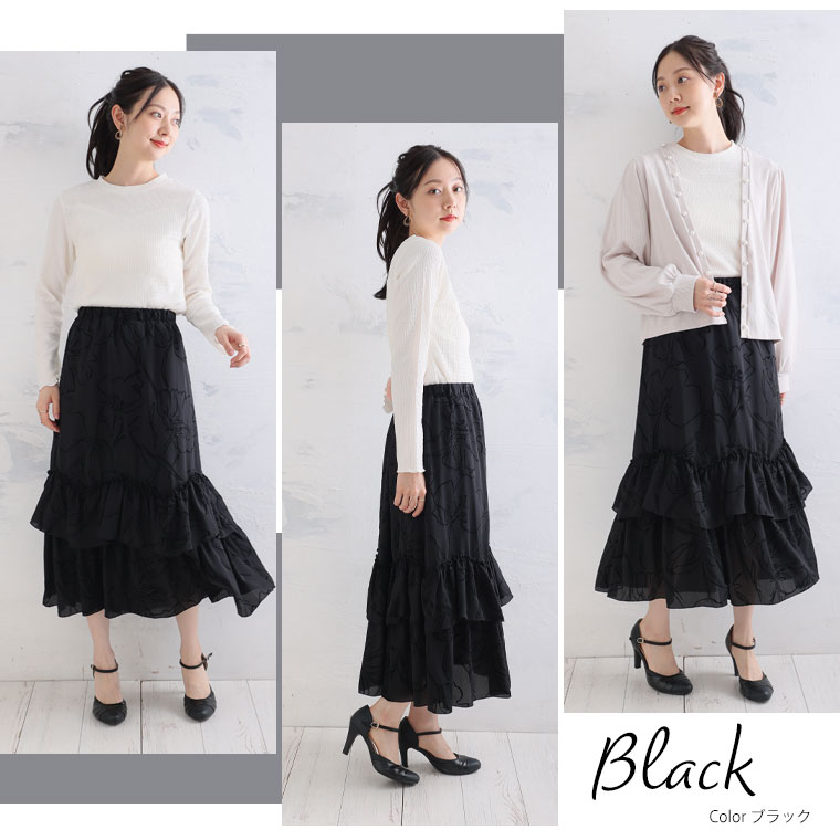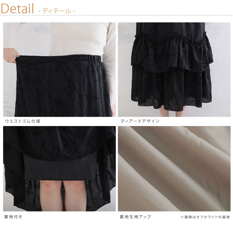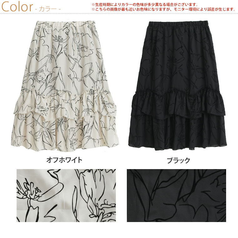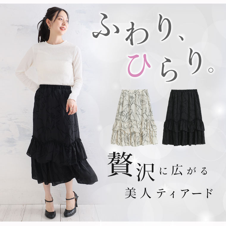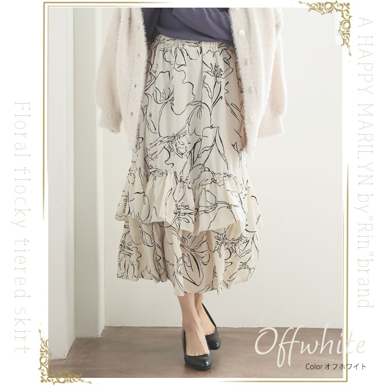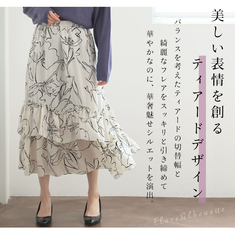 ひらり華やか ふわり軽やか フロッキープリント花柄ティアードスカート