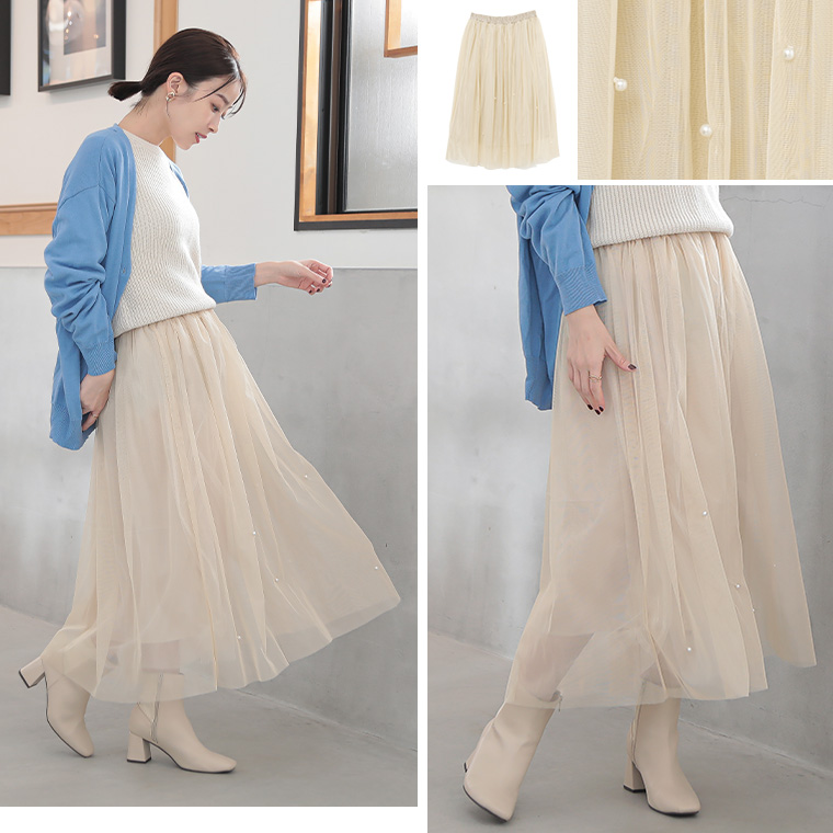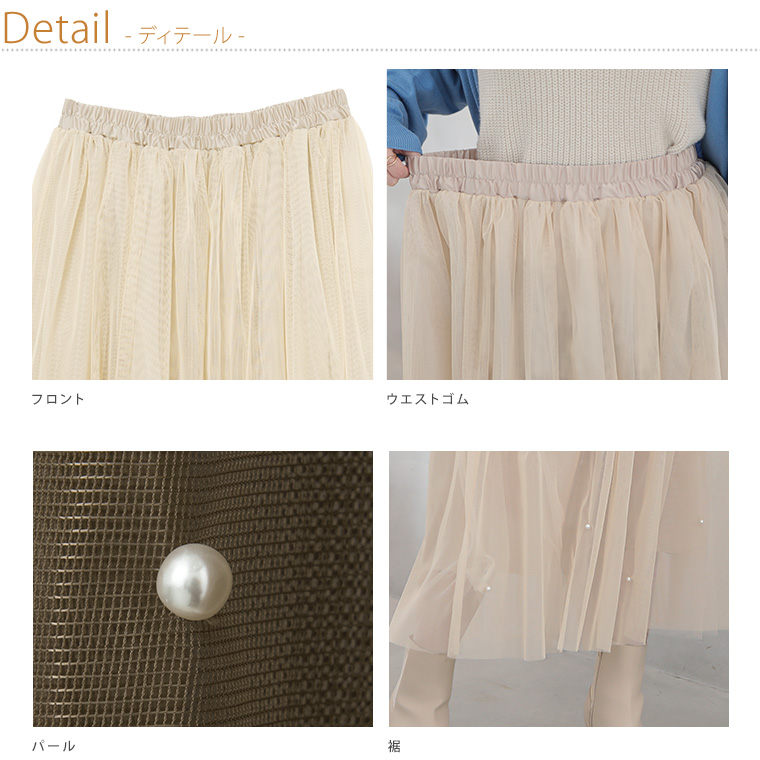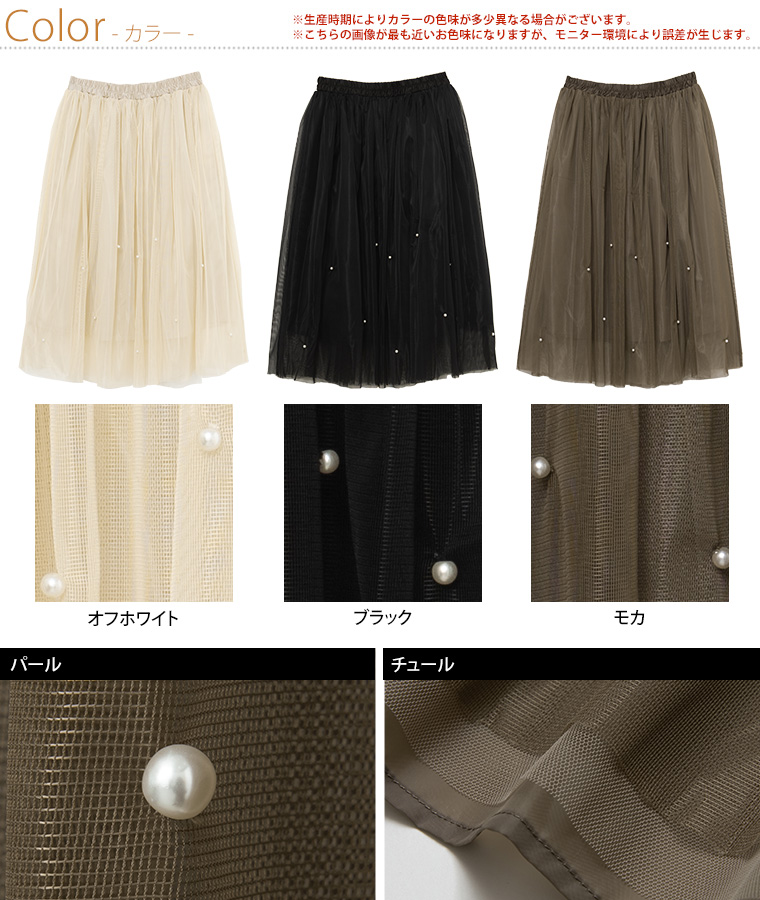 可愛いと褒められました! 軽くて履きやすいです。 チュールスカートということでほつれ等が心配でしたが、何回か着用&洗濯しても大丈夫でした。 パールは前面だけでした。