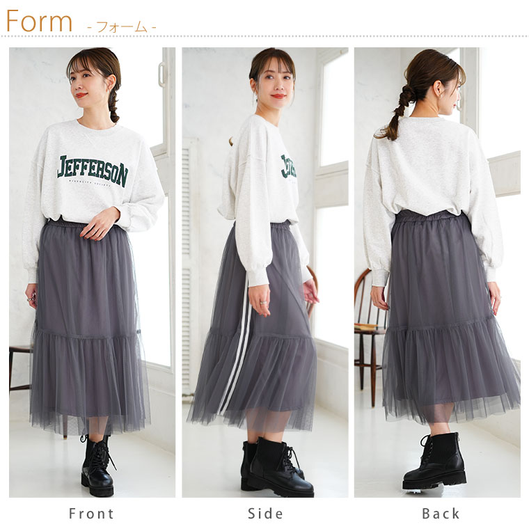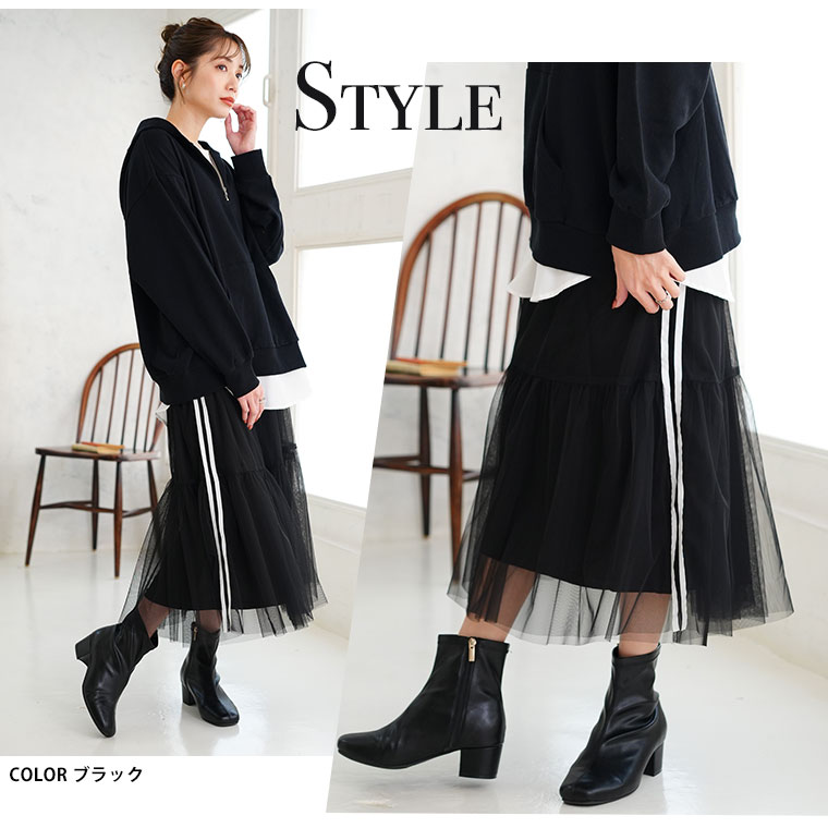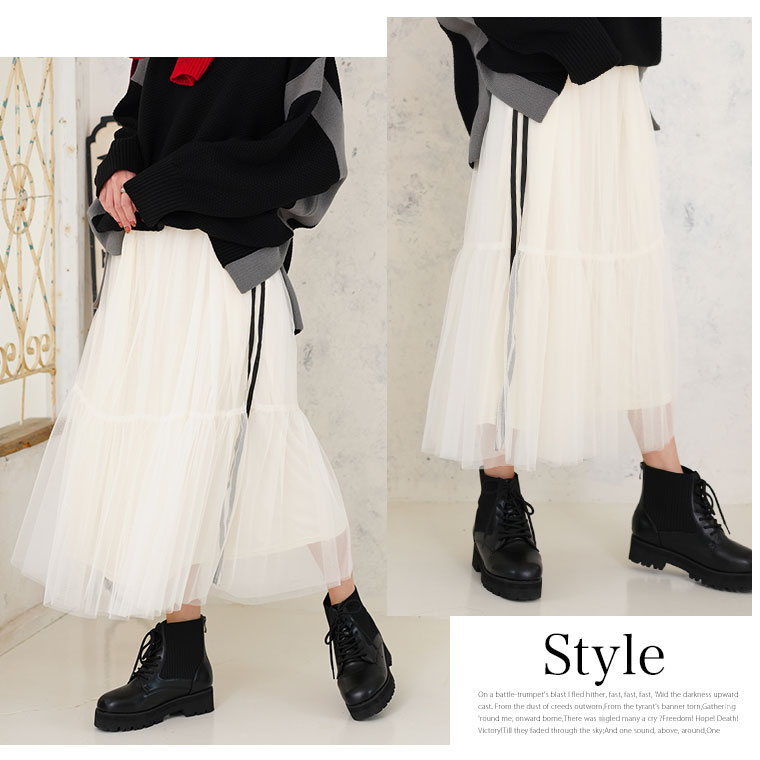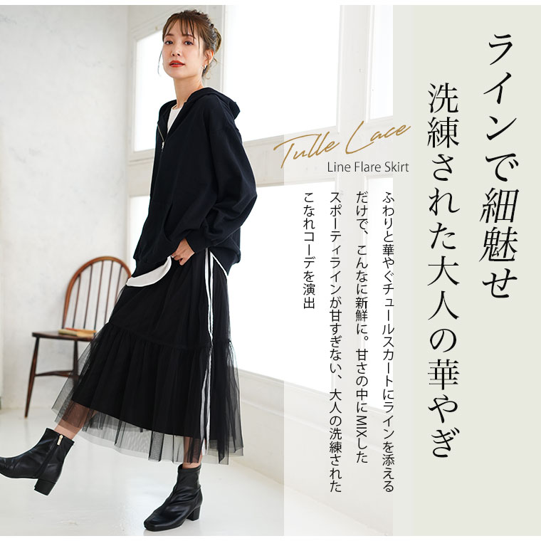 4. 大きいサイズ ライン入り 細魅せ チュール レース フレアスカート