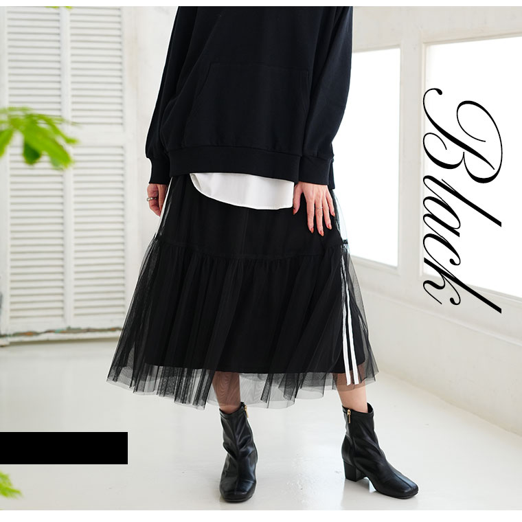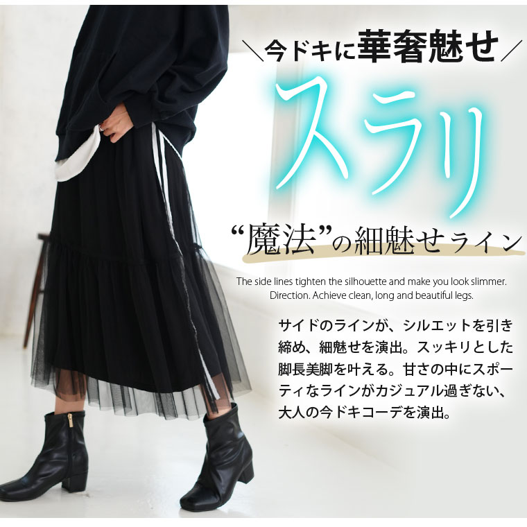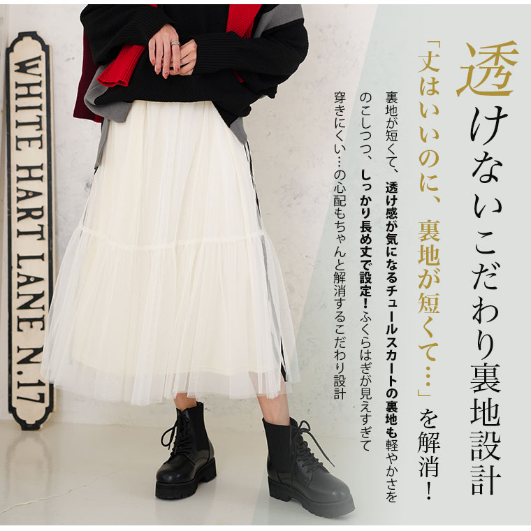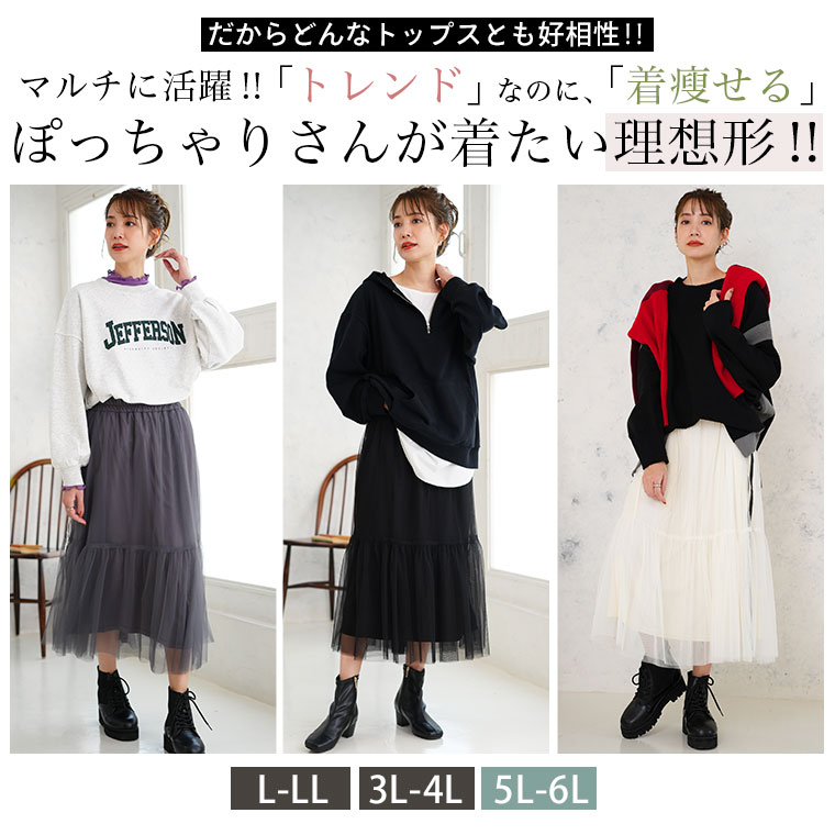 ボトムス チュールスカート LL 3L 4L 5L 6L 春 春物 春服 ぽっちゃり ゆったり プラスサイズ 太もも お尻 腰周り かわいい おしゃれ ライン入り 細魅せ チュール レース フレアスカート