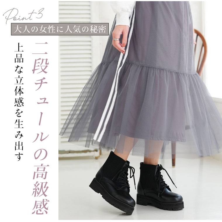 3. 大きいサイズ ライン入り 細魅せ チュール レース フレアスカート