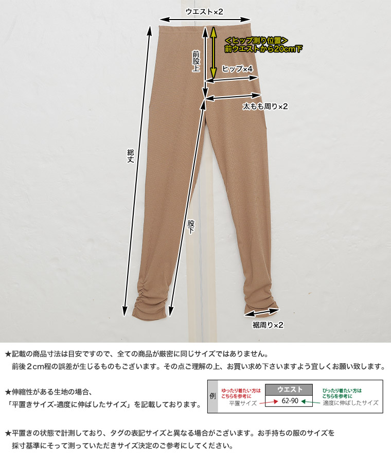 サイズ単位:cm 総丈 ウエスト ヒップ 前股上 後股上 太もも周り 股下 裾周り 素材/透け感