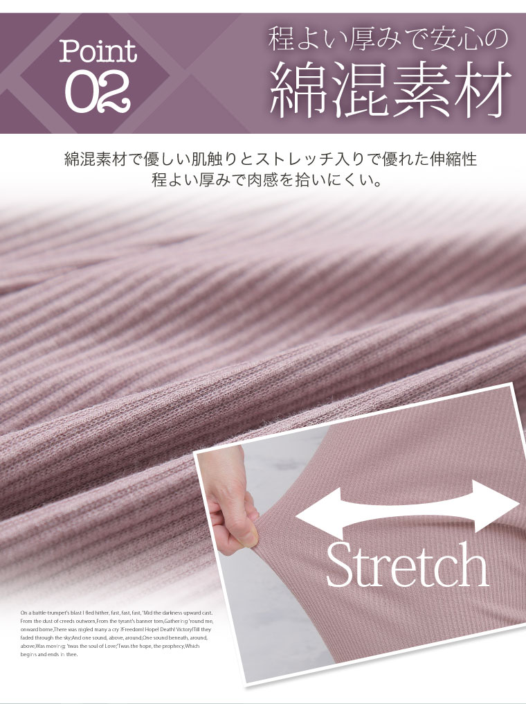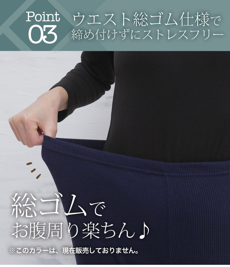 リブの縦線が脚元の細見えを叶える。ストレッチで楽ちんな履き心地。