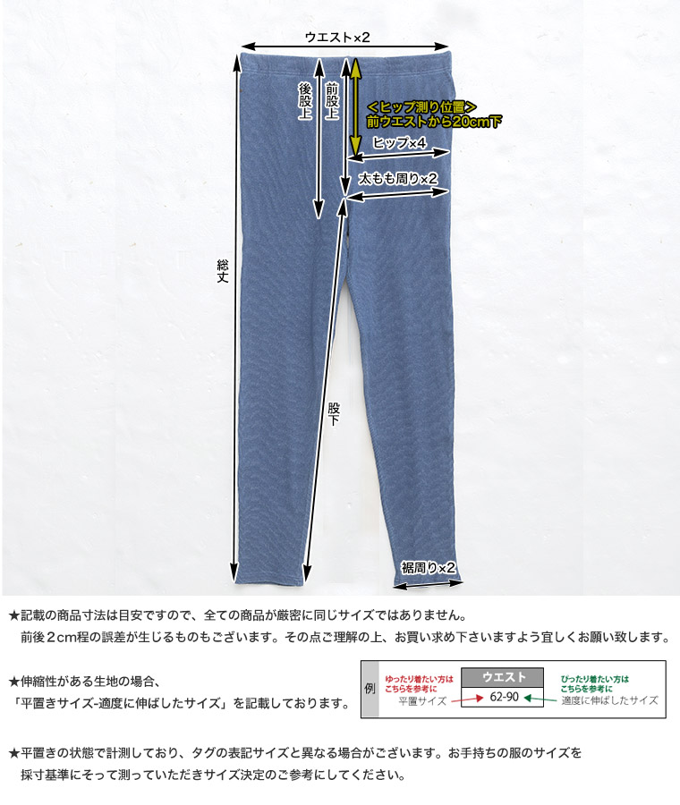 サイズ単位:cm 総丈 ウエスト ヒップ 前股上 後股上 太もも周り 股下 裾周り 素材/透け感