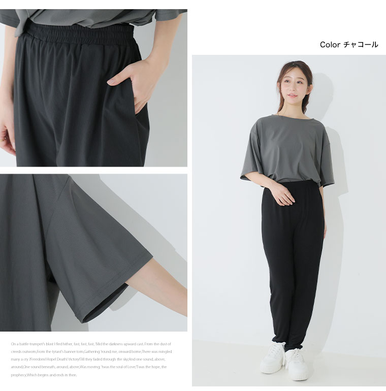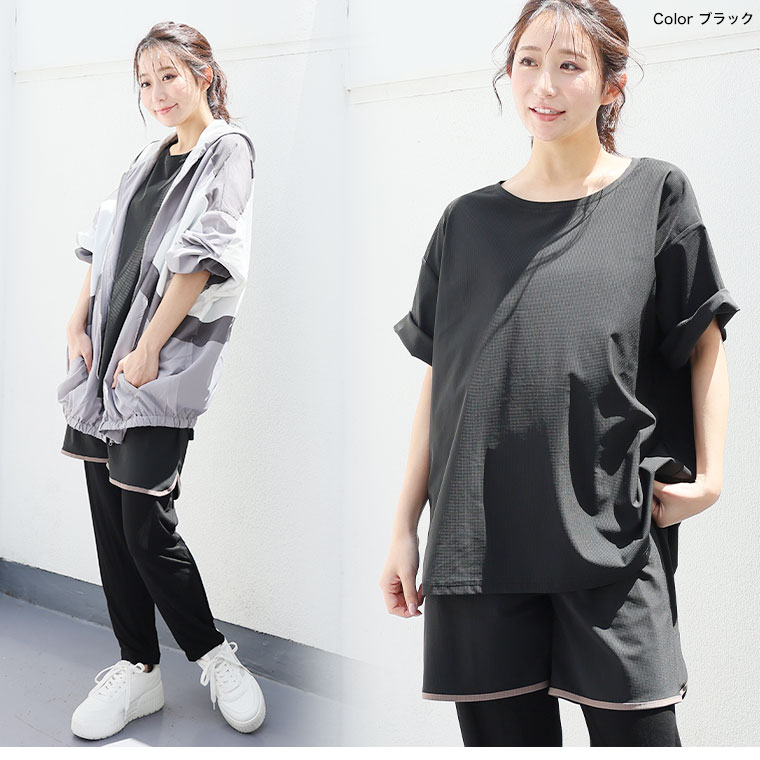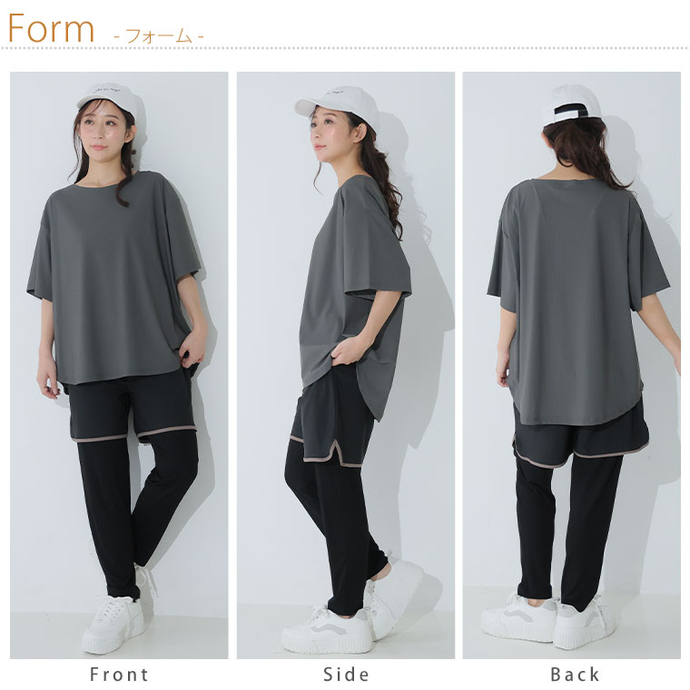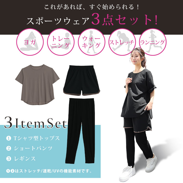Tシャツの素材がサラサラで最高です。 夏は毎日このTシャツを着たいぐらい着心地が良いです。大きめのサイズ感も◎ ショートパンツは意外と太もものラインが出てしまいましたが、こちらも軽くて速乾素材なので重宝すると思います。 レギンスは大きめでテロテロのズボンのようでした。運動することを考えると肌にピッタリしすぎず良いのかもしれません。 3点とも素材がよかったためオススメです。