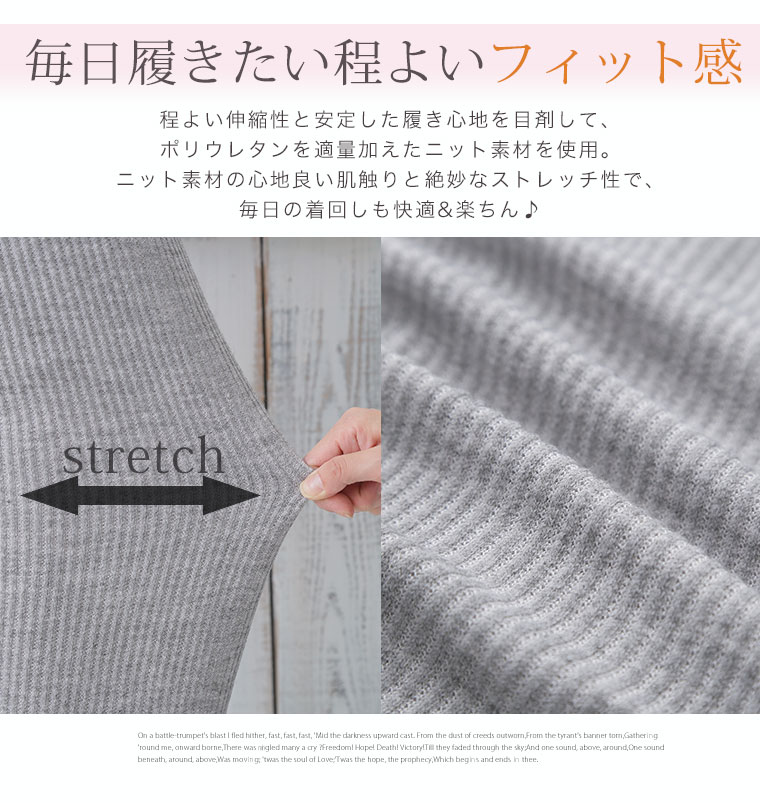 コーディネートしやすいベーシックカラー展開。リブの縦見えで脚長効果あり。