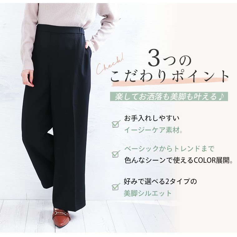 ボトムスには主に、パンツとスカートがあり下半身に着る衣服という意味があります。パンツにはトレンドのワイドパンツの他にチノパンツ、テーパードパンツ、定番のデニムなど様々な種類や素材があり、シーンよって使い分けることが可能です。ハッピーマリリンのボトムスはほとんどがウエストゴム仕様で楽ちんなのにおしゃれに着こなせるのもこだわりの一つです。定番のデニムも体型カバーが叶うハイウエストデニムやトレンドのワイドデニムの他にストレッチが効いたスキニーデニムなども大人気です。パンツだけでなく、デニムスカートも定番アイテムとして使えるアイテムで重宝間違いなしです。スカートはトレンドのプリーツスカートをメンズライクなアイテムで外して合わせるのがおすすめ。甘くなりすぎないコーデが今年顔です。フレアスカートは膝上丈よりも膝下の長め丈がトレンドです。スニーカーなどと合わせて、ほどよくカジュアルに魅せるのが可愛いです。春夏では普段モノトーンが多い方でも明るいカラーに挑戦しやすいので、くすみカラーのアイテムなどから取り入れてみると落ち着いたカラーコーデが楽しめます。また、タイトスカートも縦のラインが強調されるのでスタイルアップ効果は間違いなし。タイトスカートはやっぱり、足元にはヒールがキマリます。
