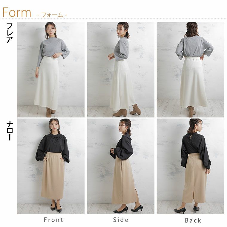 ボトムスには主に、パンツとスカートがあり下半身に着る衣服という意味があります。パンツにはトレンドのワイドパンツの他にチノパンツ、テーパードパンツ、定番のデニムなど様々な種類や素材があり、シーンよって使い分けることが可能です。ハッピーマリリンのボトムスはほとんどがウエストゴム仕様で楽ちんなのにおしゃれに着こなせるのもこだわりの一つです。定番のデニムも体型カバーが叶うハイウエストデニムやトレンドのワイドデニムの他にストレッチが効いたスキニーデニムなども大人気です。パンツだけでなく、デニムスカートも定番アイテムとして使えるアイテムで重宝間違いなしです。スカートはトレンドのプリーツスカートをメンズライクなアイテムで外して合わせるのがおすすめ。甘くなりすぎないコーデが今年顔です。フレアスカートは膝上丈よりも膝下の長め丈がトレンドです。スニーカーなどと合わせて、ほどよくカジュアルに魅せるのが可愛いです。春夏では普段モノトーンが多い方でも明るいカラーに挑戦しやすいので、くすみカラーのアイテムなどから取り入れてみると落ち着いたカラーコーデが楽しめます。また、タイトスカートも縦のラインが強調されるのでスタイルアップ効果は間違いなし。タイトスカートはやっぱり、足元にはヒールがキマリます。