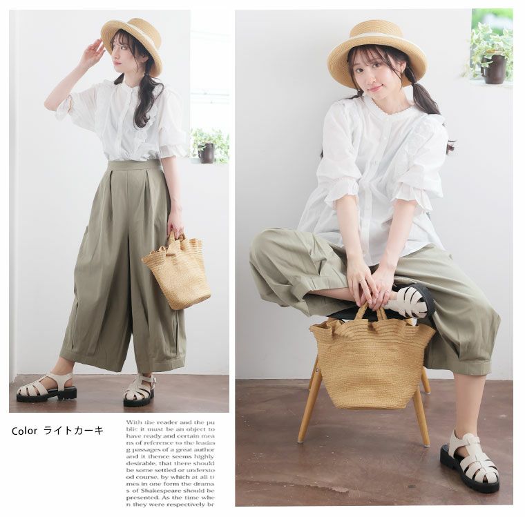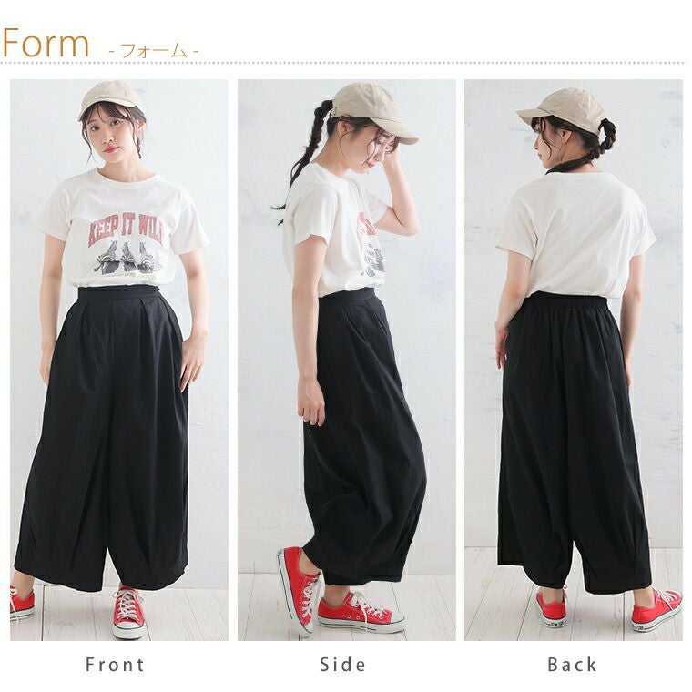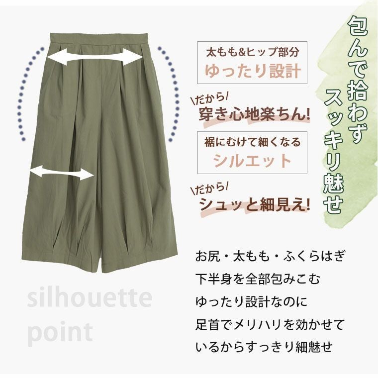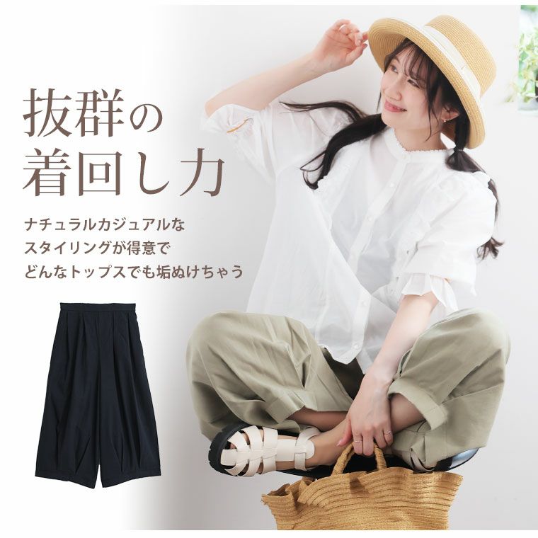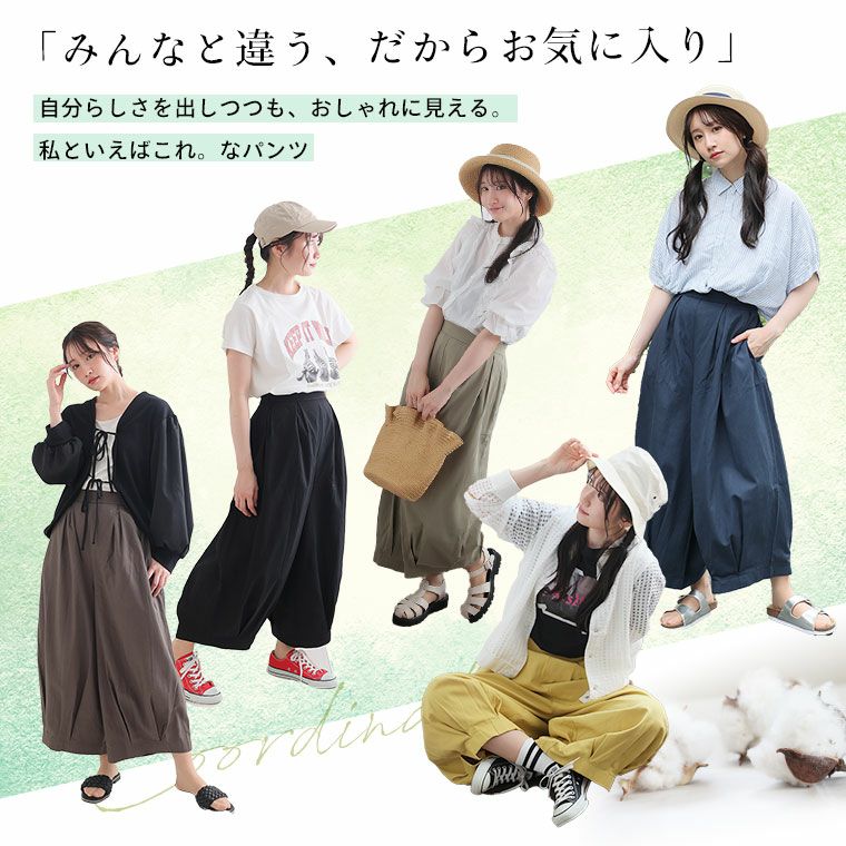 ボトムスには主に、パンツとスカートがあり下半身に着る衣服という意味があります。パンツにはトレンドのワイドパンツの他にチノパンツ、テーパードパンツ、定番のデニムなど様々な種類や素材があり、シーンよって使い分けることが可能です。ハッピーマリリンのボトムスはほとんどがウエストゴム仕様で楽ちんなのにおしゃれに着こなせるのもこだわりの一つです。定番のデニムも体型カバーが叶うハイウエストデニムやトレンドのワイドデニムの他にストレッチが効いたスキニーデニムなども大人気です。パンツだけでなく、デニムスカートも定番アイテムとして使えるアイテムで重宝間違いなしです。スカートはトレンドのプリーツスカートをメンズライクなアイテムで外して合わせるのがおすすめ。甘くなりすぎないコーデが今年顔です。フレアスカートは膝上丈よりも膝下の長め丈がトレンドです。スニーカーなどと合わせて、ほどよくカジュアルに魅せるのが可愛いです。春夏では普段モノトーンが多い方でも明るいカラーに挑戦しやすいので、くすみカラーのアイテムなどから取り入れてみると落ち着いたカラーコーデが楽しめます。また、タイトスカートも縦のラインが強調されるのでスタイルアップ効果は間違いなし。タイトスカートはやっぱり、足元にはヒールがキマリます。