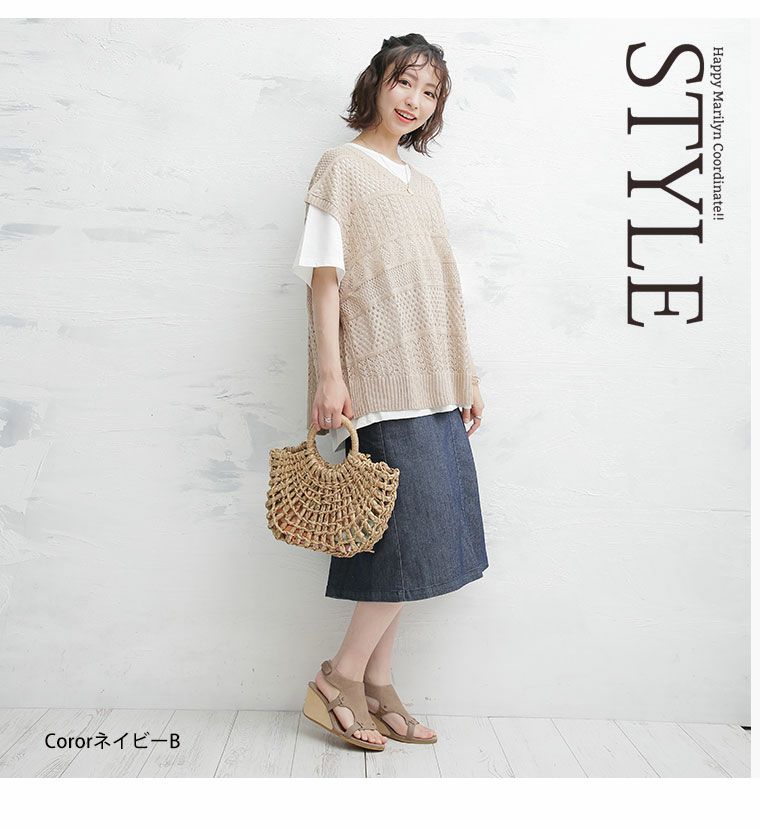 ボトムスには主に、パンツとスカートがあり下半身に着る衣服という意味があります。パンツにはトレンドのワイドパンツの他にチノパンツ、テーパードパンツ、定番のデニムなど様々な種類や素材があり、シーンよって使い分けることが可能です。ハッピーマリリンのボトムスはほとんどがウエストゴム仕様で楽ちんなのにおしゃれに着こなせるのもこだわりの一つです。定番のデニムも体型カバーが叶うハイウエストデニムやトレンドのワイドデニムの他にストレッチが効いたスキニーデニムなども大人気です。パンツだけでなく、デニムスカートも定番アイテムとして使えるアイテムで重宝間違いなしです。スカートはトレンドのプリーツスカートをメンズライクなアイテムで外して合わせるのがおすすめ。甘くなりすぎないコーデが今年顔です。フレアスカートは膝上丈よりも膝下の長め丈がトレンドです。スニーカーなどと合わせて、ほどよくカジュアルに魅せるのが可愛いです。春夏では普段モノトーンが多い方でも明るいカラーに挑戦しやすいので、くすみカラーのアイテムなどから取り入れてみると落ち着いたカラーコーデが楽しめます。また、タイトスカートも縦のラインが強調されるのでスタイルアップ効果は間違いなし。タイトスカートはやっぱり、足元にはヒールがキマリます。