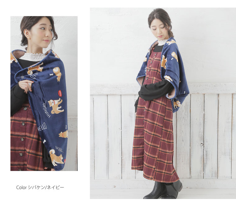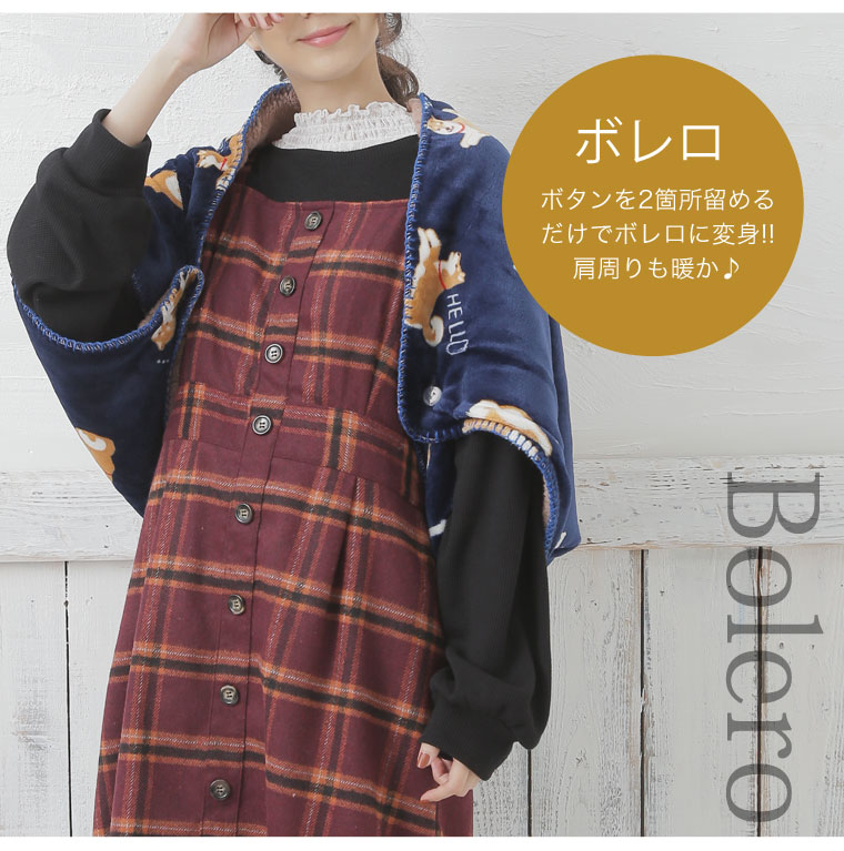 そのまま広げてひざ掛けに。ボタンを使ってボレロやポンチョに!!