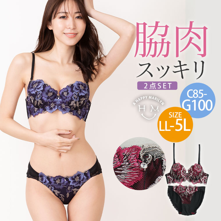 脇高 フェミニン刺繍がかわいいブラ・ショーツセット
