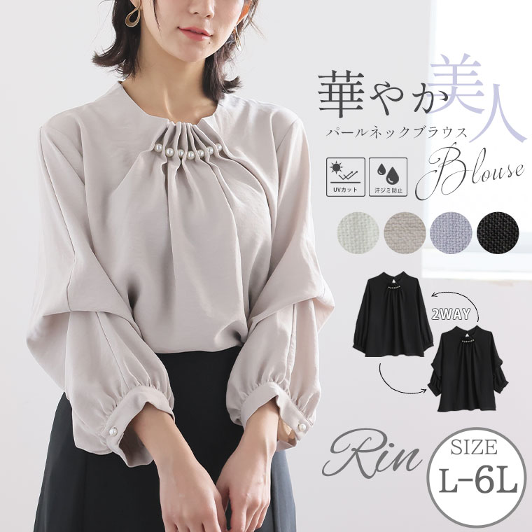 6. 大きいサイズ Rin 上品レディ 袖2way 首元パール 美人 ポーラブラウス UV UVケア 汗染み防止 オフィス 大人 着やせ 体型カバー ビジネス 通勤 ママ セレモニー uv 【セレモニー】