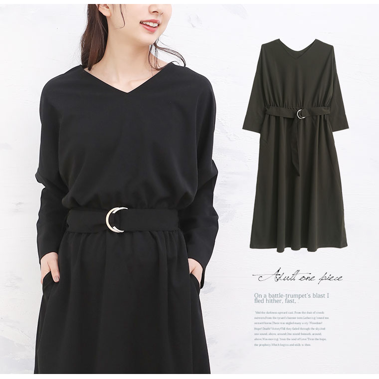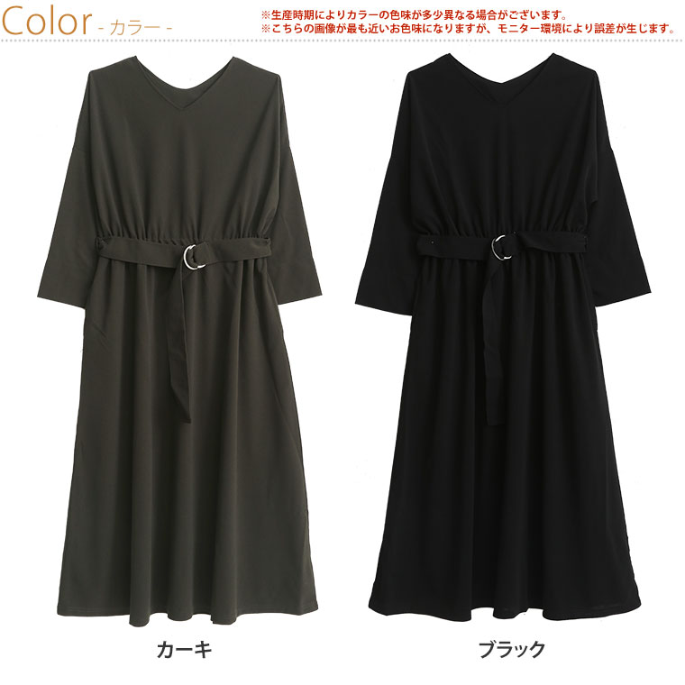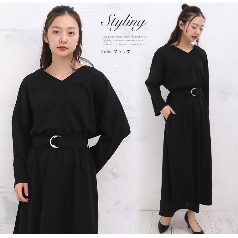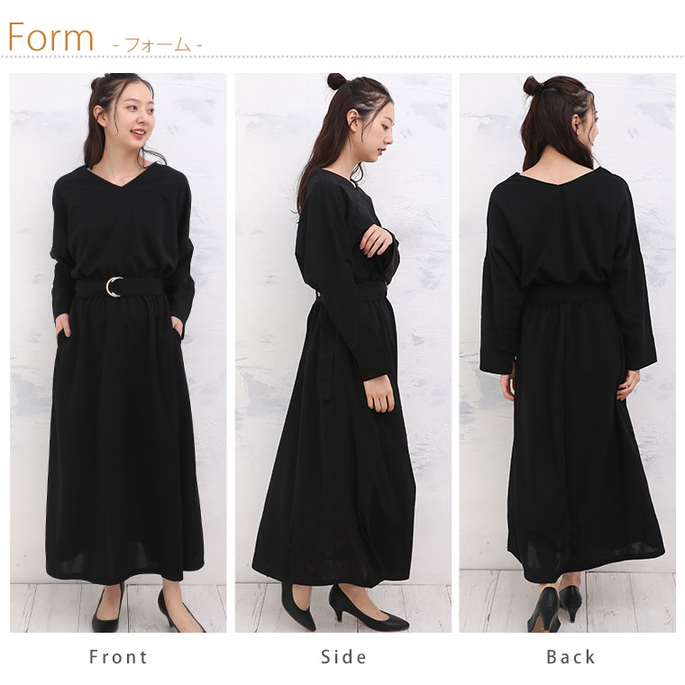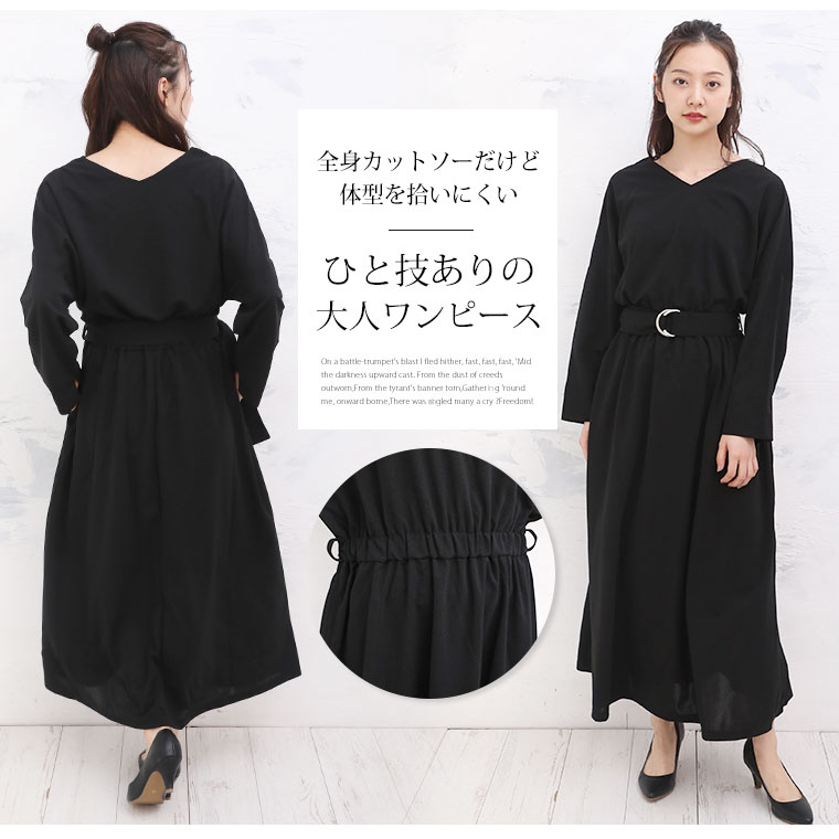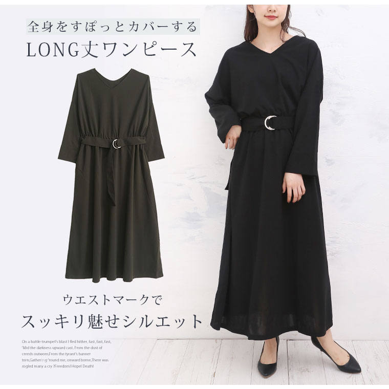 ウエストのベルトできゅっと締めるロング丈ワンピース
