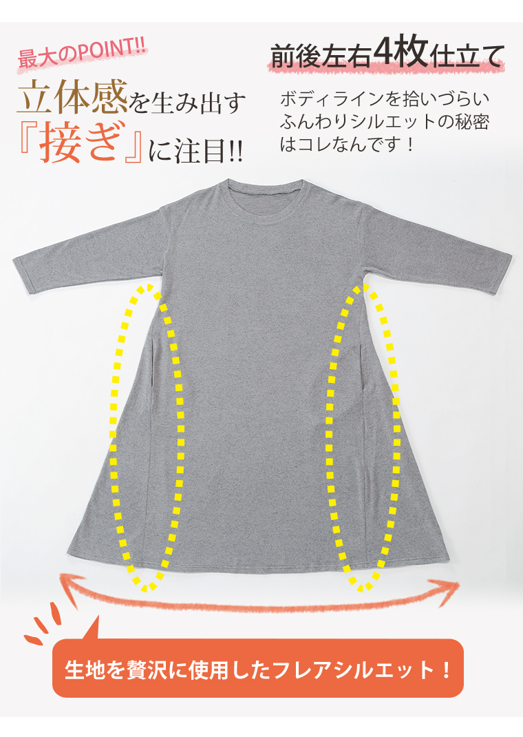 脇切替で立体的に仕上げたシルエットが可愛い。体型カバーにも◎の細魅せワンピです