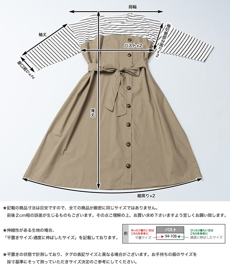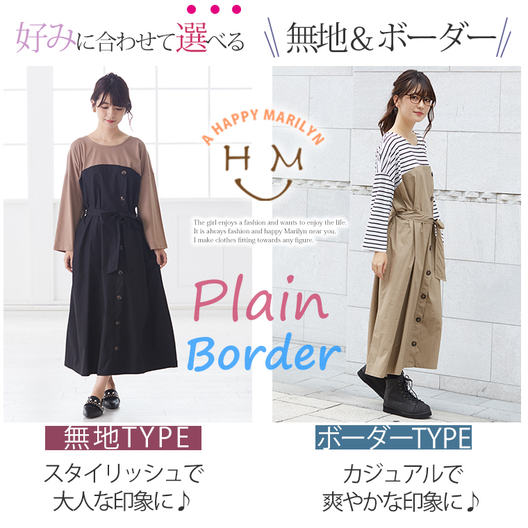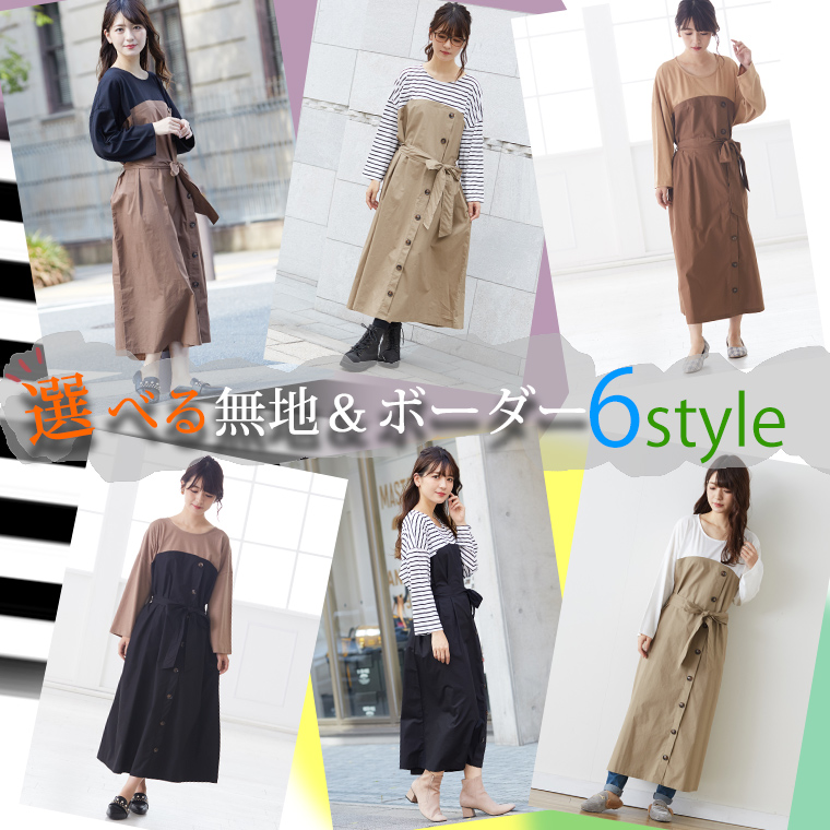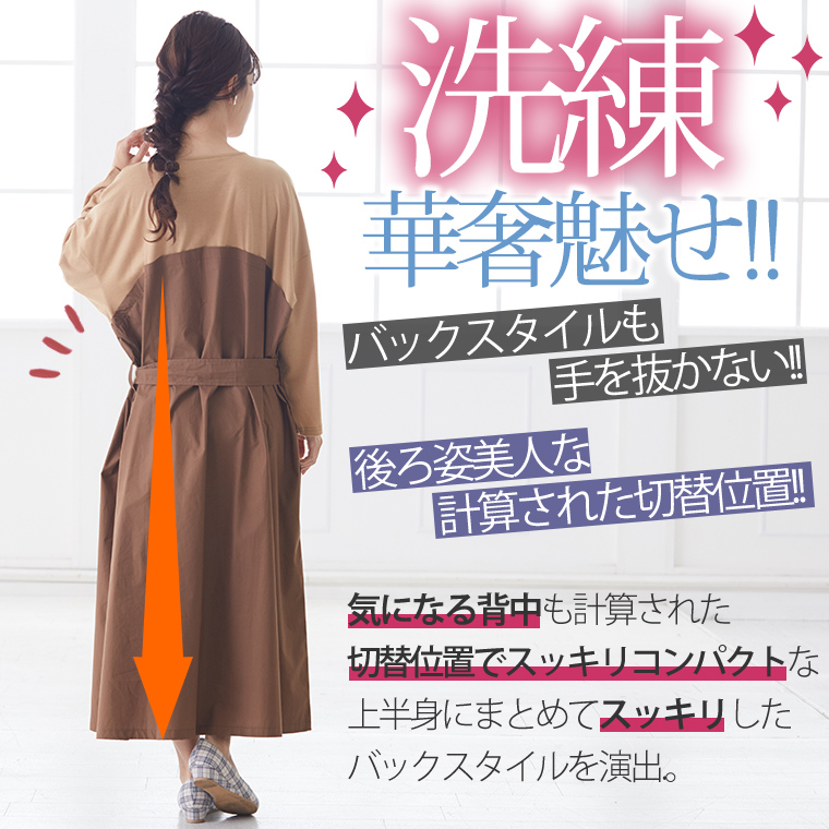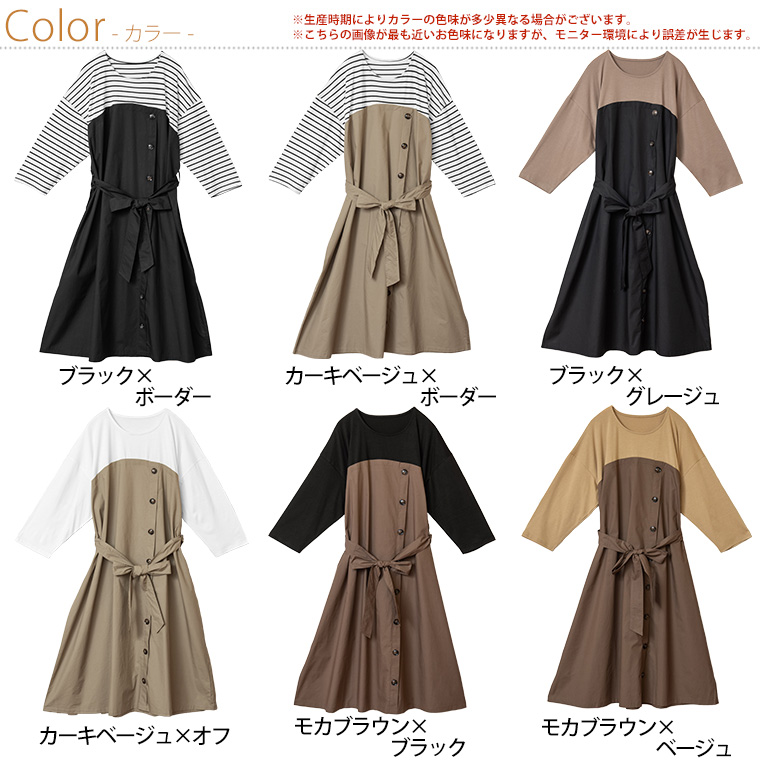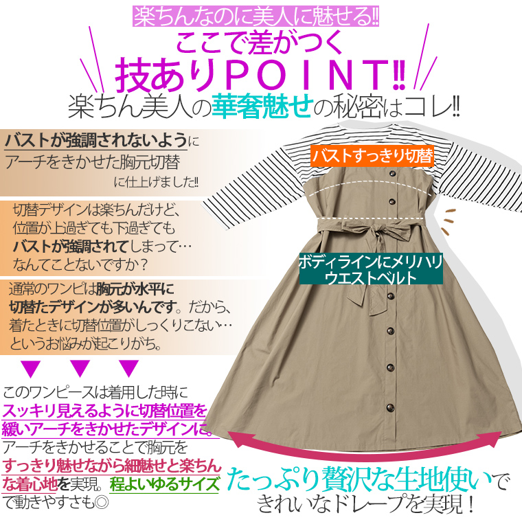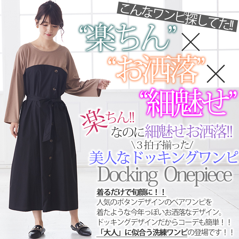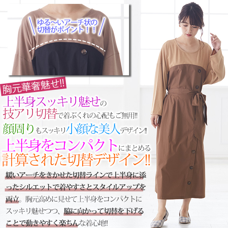4. 大きいサイズ 楽ちん 美人な 大人の 細魅せ ボタンデザイン 長袖 ドッキングワンピ