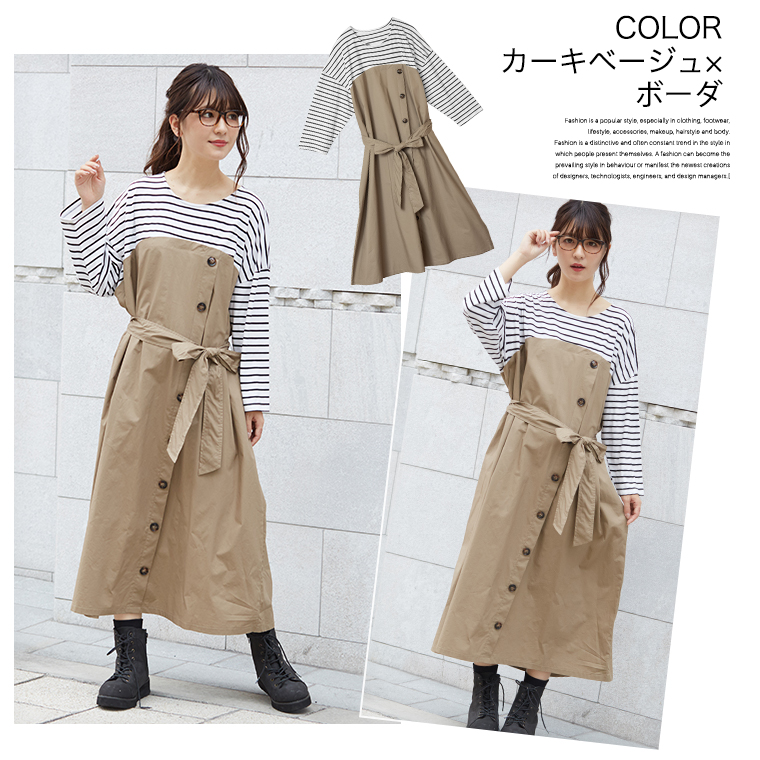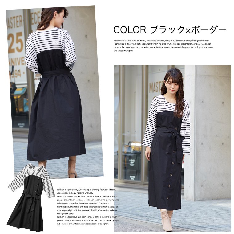 3. 大きいサイズ 楽ちん 美人な 大人の 細魅せ ボタンデザイン 長袖 ドッキングワンピ