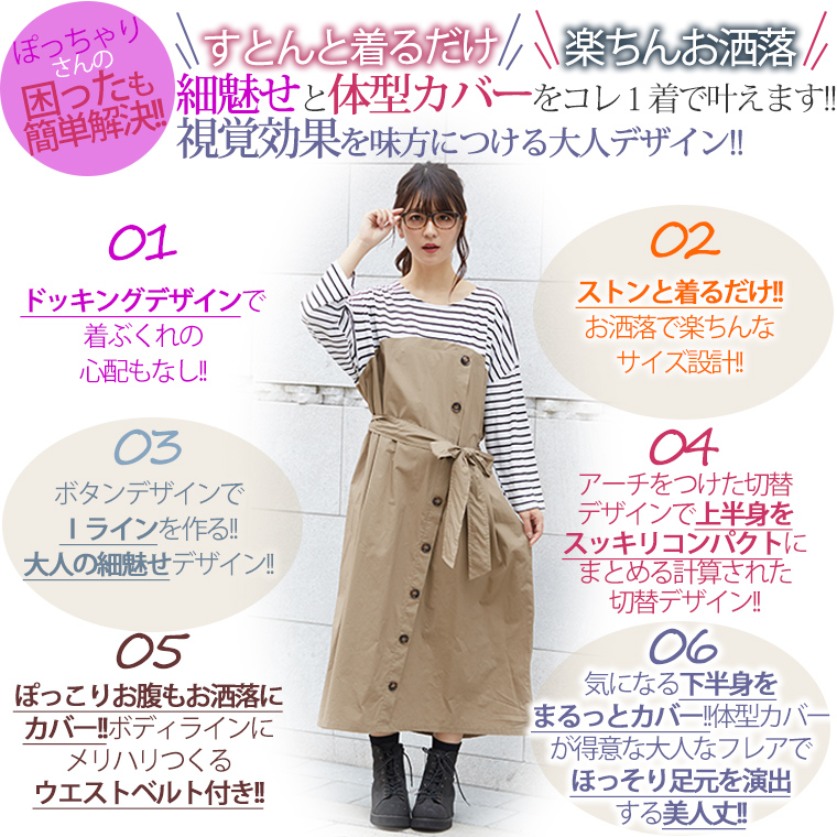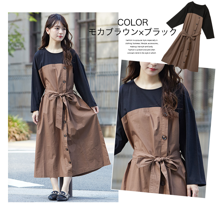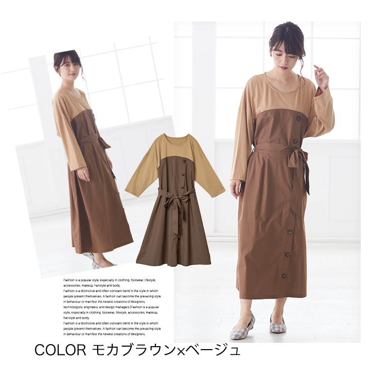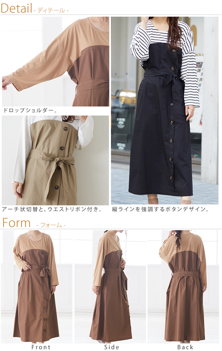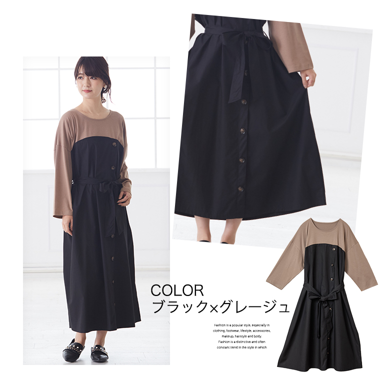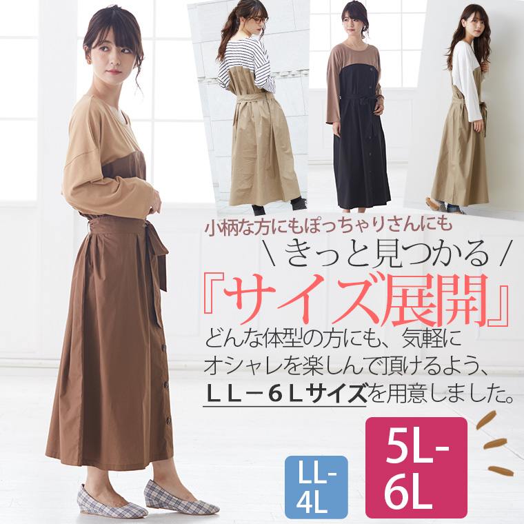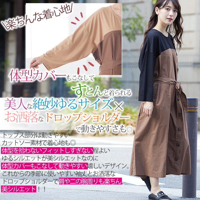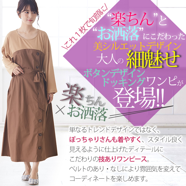 オリジナル ワンピース ワンピ LL 3L 4L 5L 6L 秋 秋物 秋冬 ぽっちゃり ゆったり かわいい おしゃれ お腹 胸周り 腰周り 楽ちん 美人な 大人の 細魅せ ボタンデザイン 長袖 ドッキングワンピ